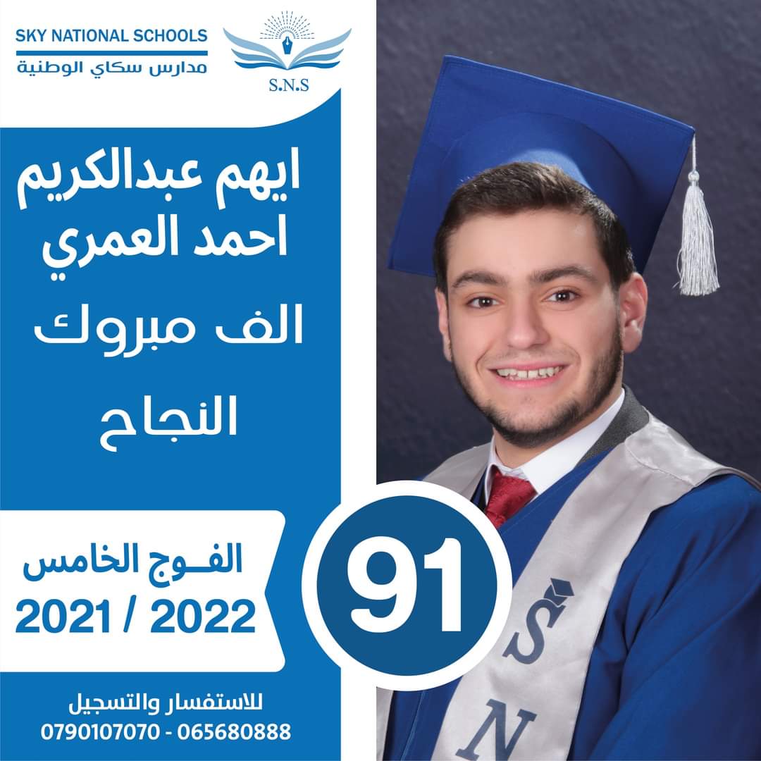الوالد المخرج عبدالكريم العمري والوالدة ردينة العمري والأشقاء الدكتور أحمد وأيسر و شام والأهل والأصدقاء جميعا يهنئون ابنهم أيهم عبدالكريم احمد العمري بنجاحه في الثانوية العامة بمعدل 91 الفرع العلمي ألف ألف ألف مبروووك