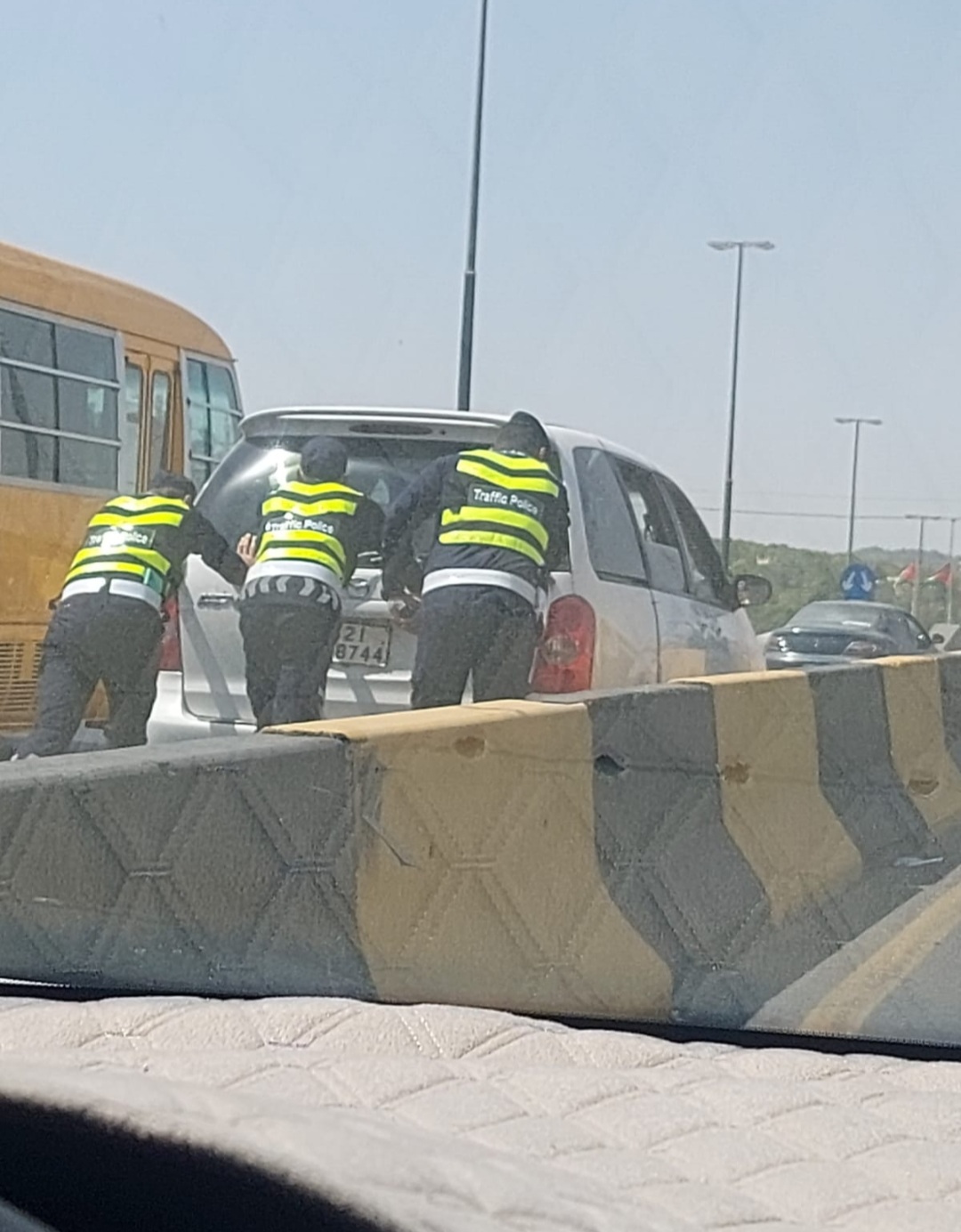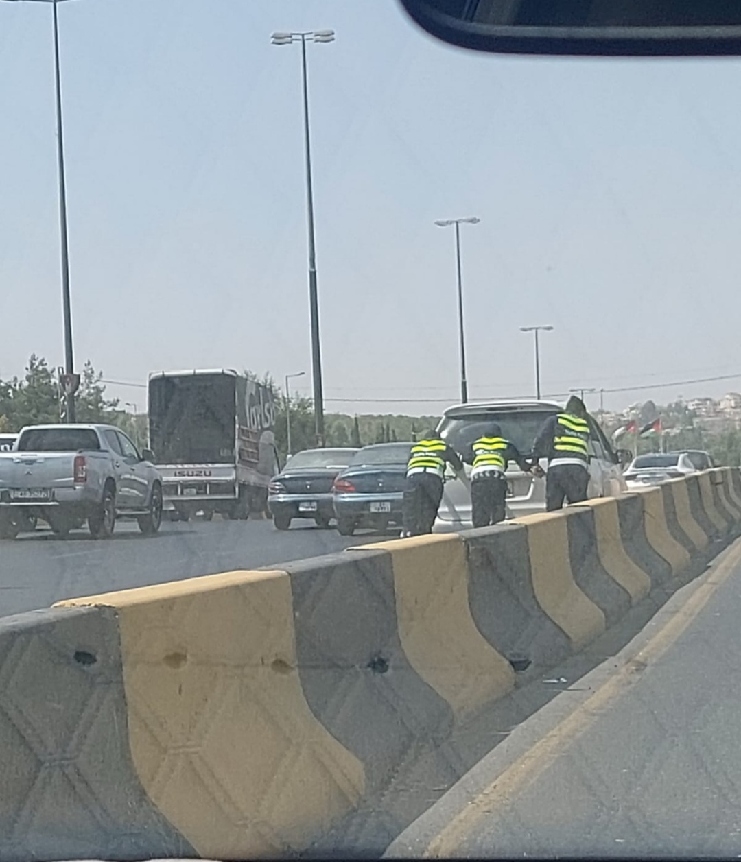 عمانيات - نشامى من كوادر الأمن العام يساعدون سيارة تعطلت في شارع الملك عبدالله الثاني في عمان أمام بوابة المدينة الطبية