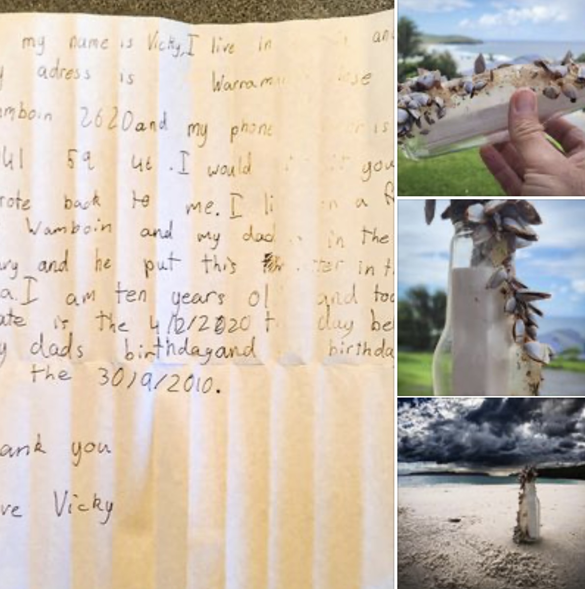 وقال سكوت غوترسون، الذي كان يسبح في شاطئ مورايس بخليج جيرفيس، إنه عثر على الزجاجة مغطاة بأصداف البحر، وداخلها رسالة ورقية.