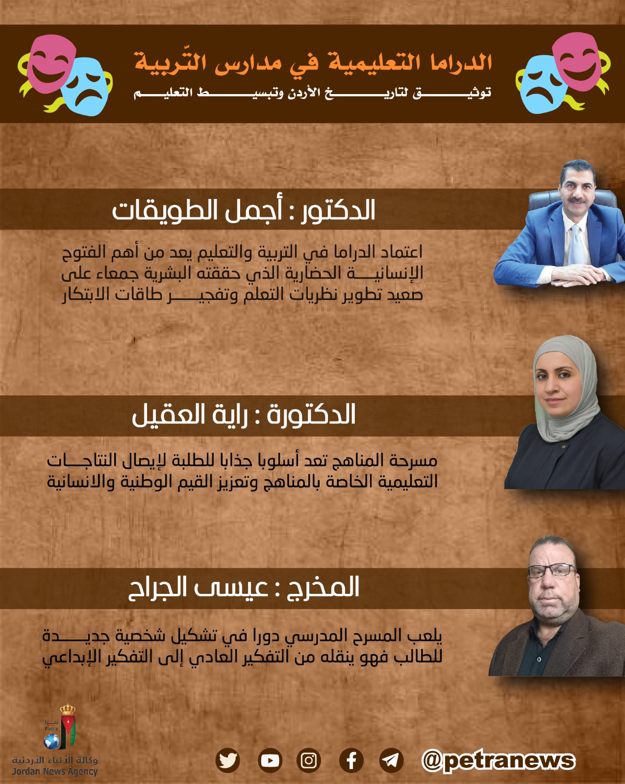 ويؤكد متخصصون لـ (بترا) أهمية المسرح في إعداد الطلبة وتوجيههم نحو القيم التربوية وصقلهم روحياً ونفسيًا، وأنَّه نافذة تربوية مثلى يطل الطالب من خلالها على ذاته الداخلية.