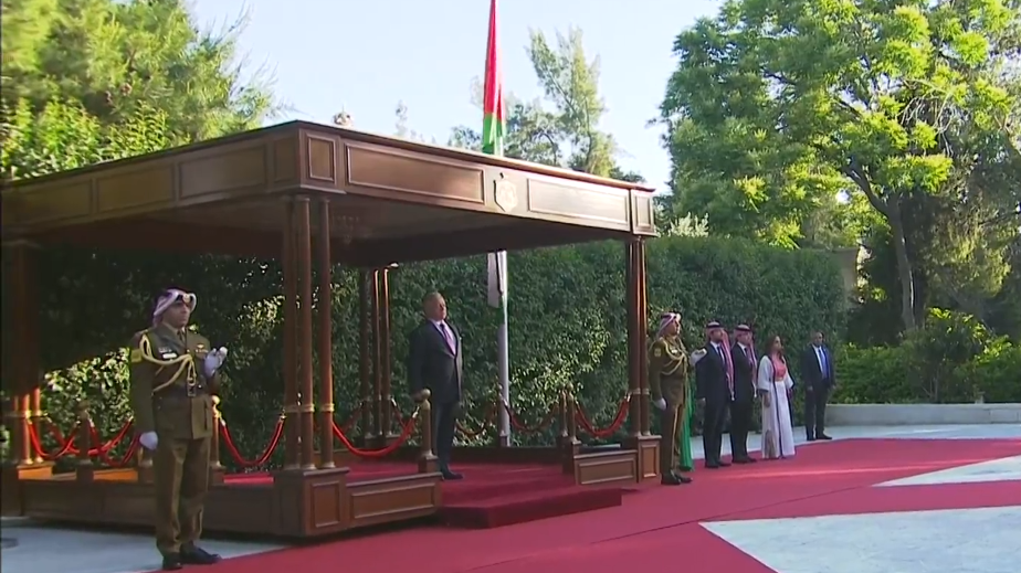 ولدى وصول جلالة الملك إلى موقع الحفل محاطا بالموكب الأحمر، أطلقت المدفعية 21 طلقة تحية لجلالته، فيما استعرض جلالته حرس الشرف الذي اصطف لتحيته، وعزفت الموسيقى السلام الملكي.