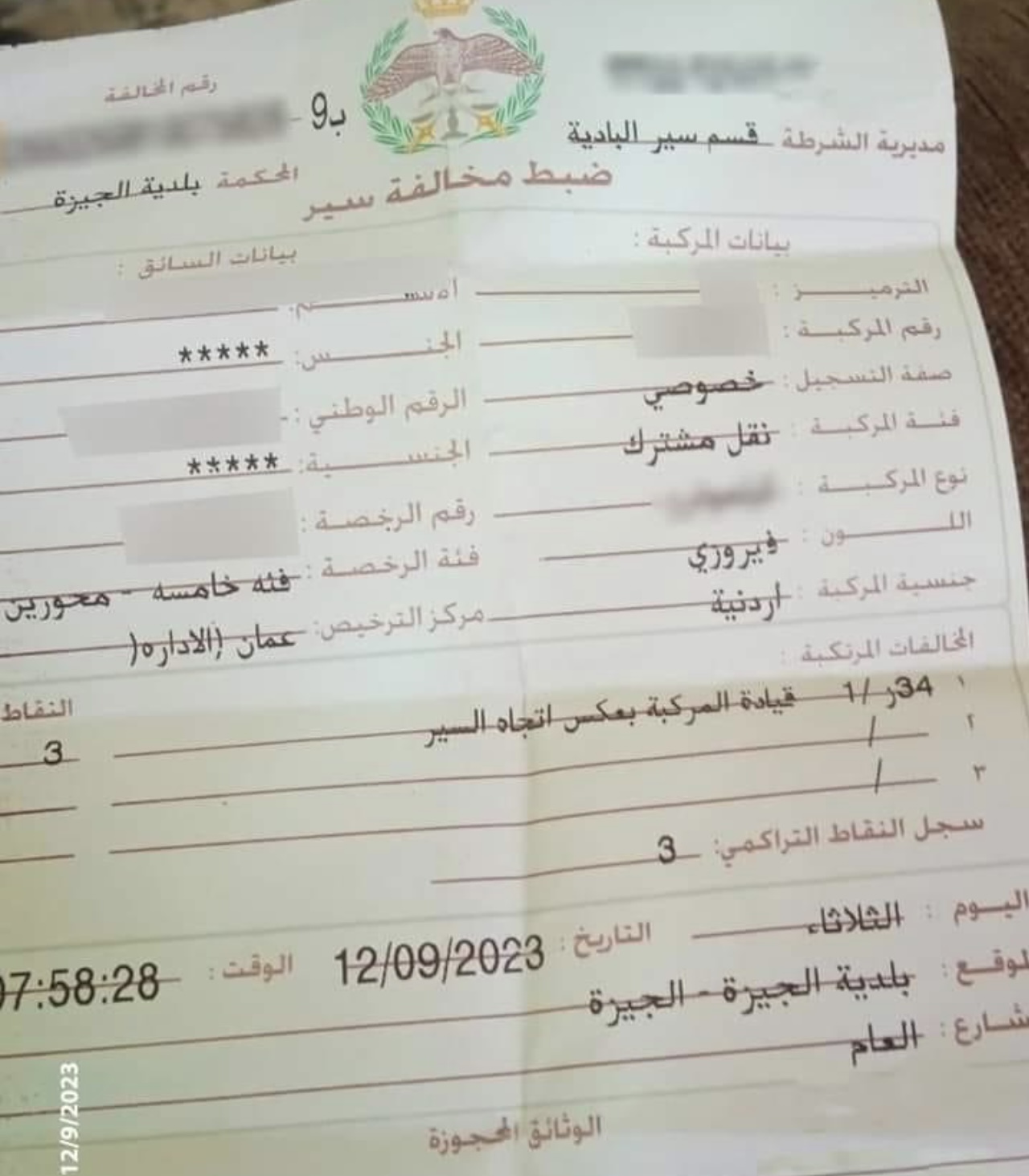 - اول مخالفة بعد تطبيق قانون السير الجديد قيمتها 250 دينارا