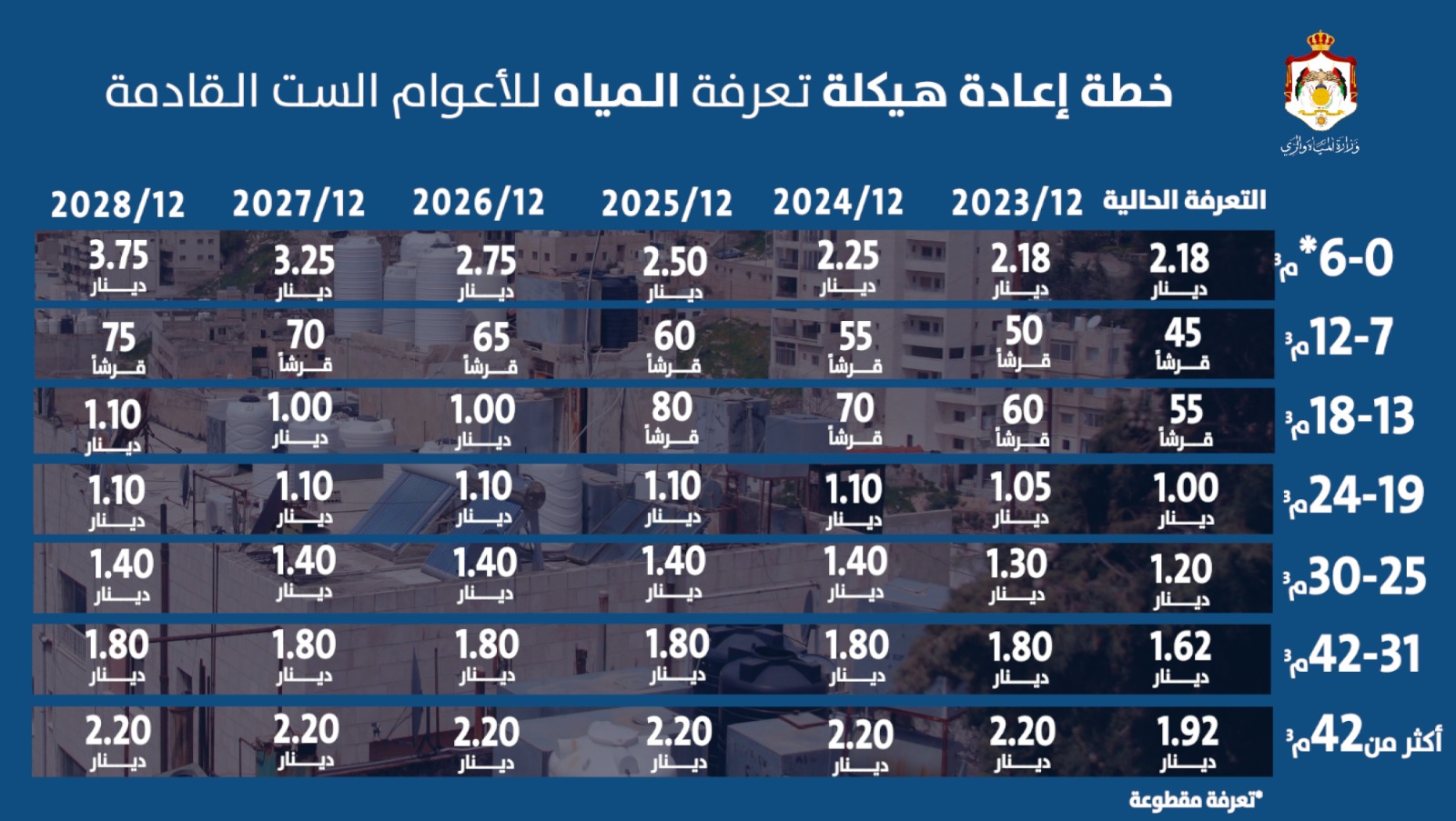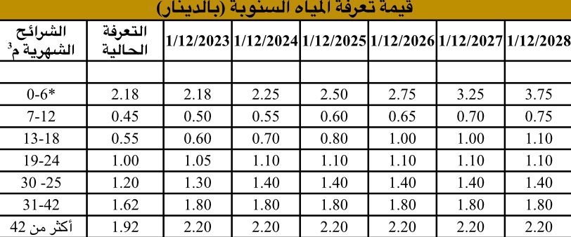 كما تضمّنت الخطة الزيادات التدريجية السنوية على تعرفة المياه للأعوام الست القادمة وعلى النحو التالي: