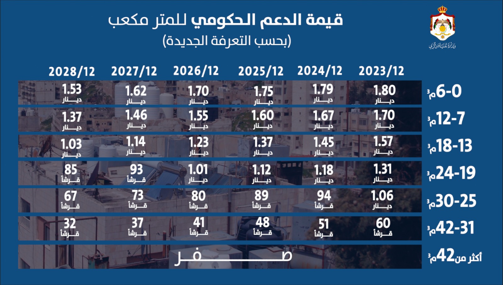 وستستمّر الحكومة في دعم الكلف الإجمالية للمياه والصرف الصحي حتى بعد عام 2028 لمراعاة ذوي الدخل المحدود؛ إذْ ستبلغ قيمة الدعم الحكومي في عام 2024 وبحسب متوسط التكلفة الإجمالية للمتر المكعب من المياه للشريحة الأولى 180 قرشاً (82 بالمئة) من التكلفة الإجمالية، و170 قرشاً للشريحة الثانية (77 بالمئة) من التكلفة الإجمالية، و157 قرشاً للشريحة الثالثة (71 بالمئة) من التكلفة الإجمالية، و131 قرشاً للشريحة الرابعة (60 بالمئة) من التكلفة الإجمالية، و106 قروش للشريحة الخامسة (48بالمئة) من التكلفة الإجمالية، و60 قرشاً للشريحة السادسة (27 بالمئة) من التكلفة الإجمالية، في حين لا يتّم دعم الشريحة السابعة والتي يفوق استهلاكها 42م3 شهريّاً.