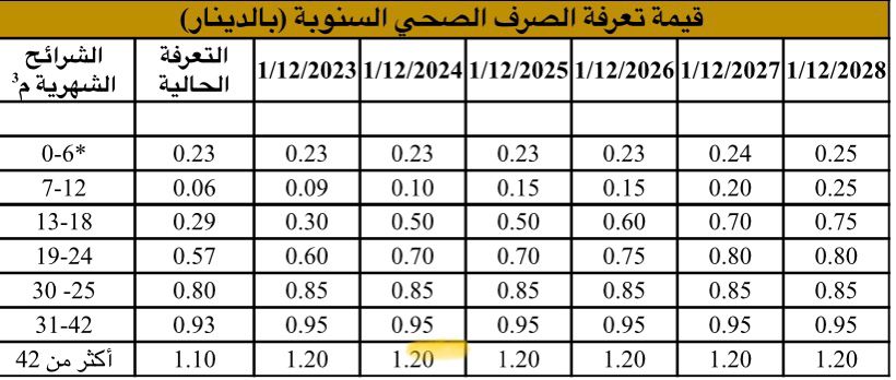 وتضمنّت خطة إعادة هيكلة تعرفة المياه والصرف الصحي زيادة تدريجية سنوية على قيم تعرفة المياه والصرف الصحي للاستهلاك المنزلي بمتوسط زيادة تبلغ نسبته 4.6 بالمئة، وذلك ابتداءً من 1/12/2023 لغاية 1/12/2028، لتغطّي كلف التشغيل والصيانة تدريجياً بحلول 2030، على أن يبدأ تطبيق التعرفة الجديدة اعتباراً من شهر كانون الأول المقبل لتنعكس على فاتورة شهر كانون الثاني المقبل 2024.