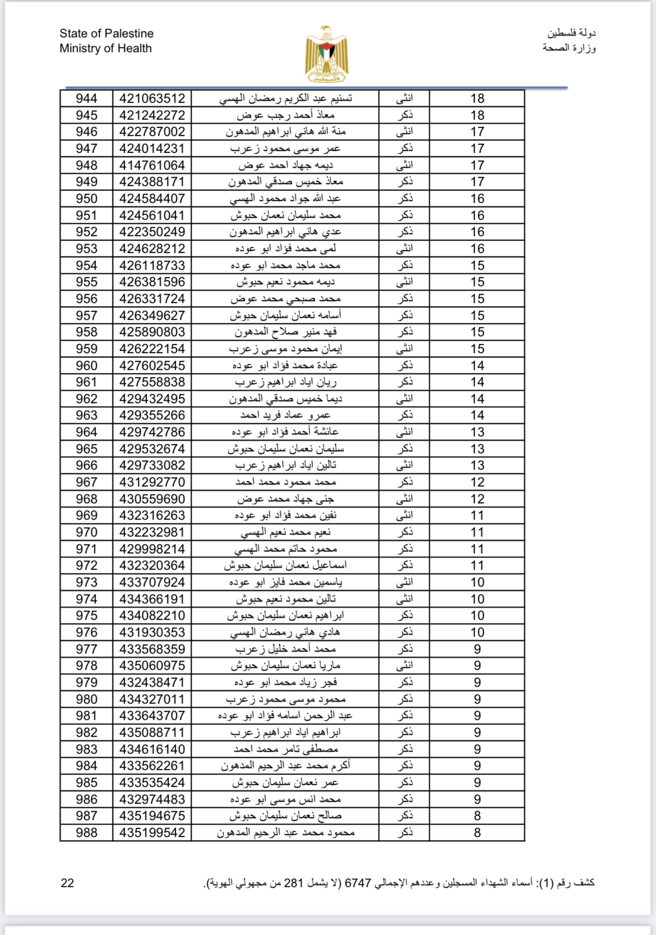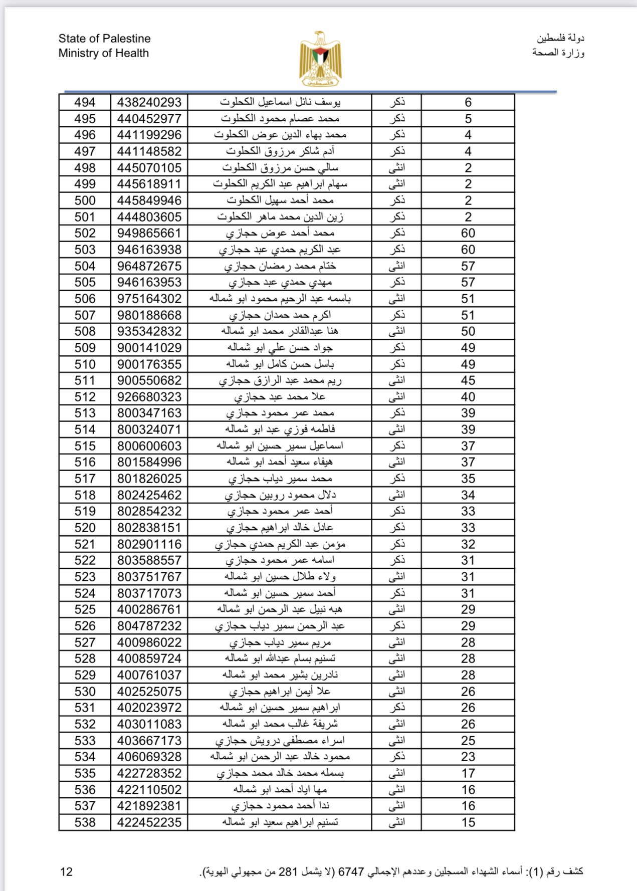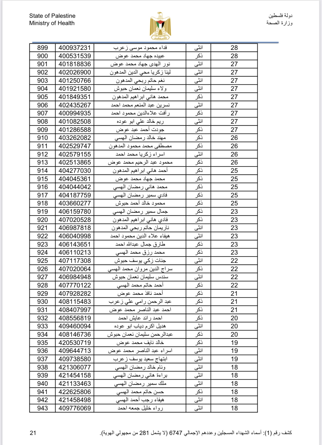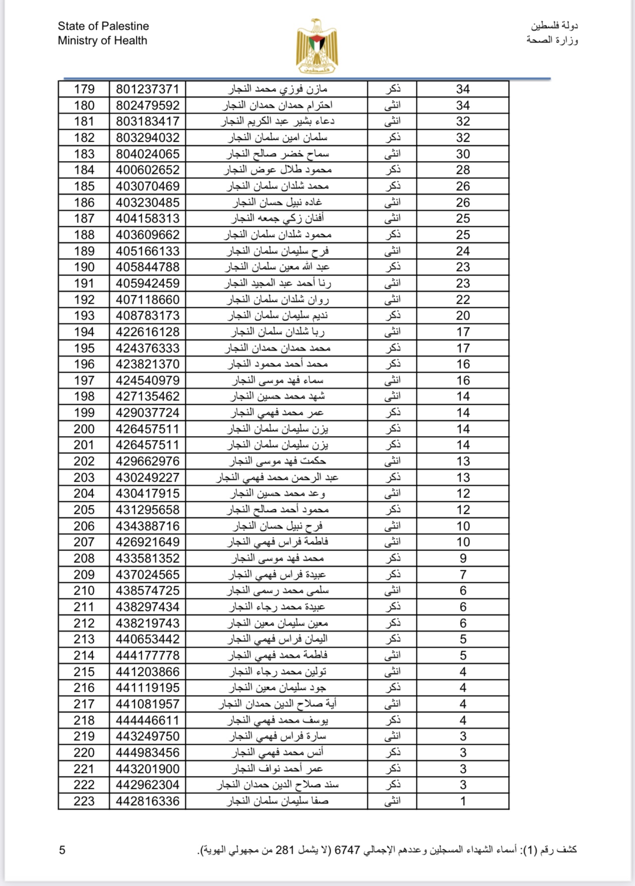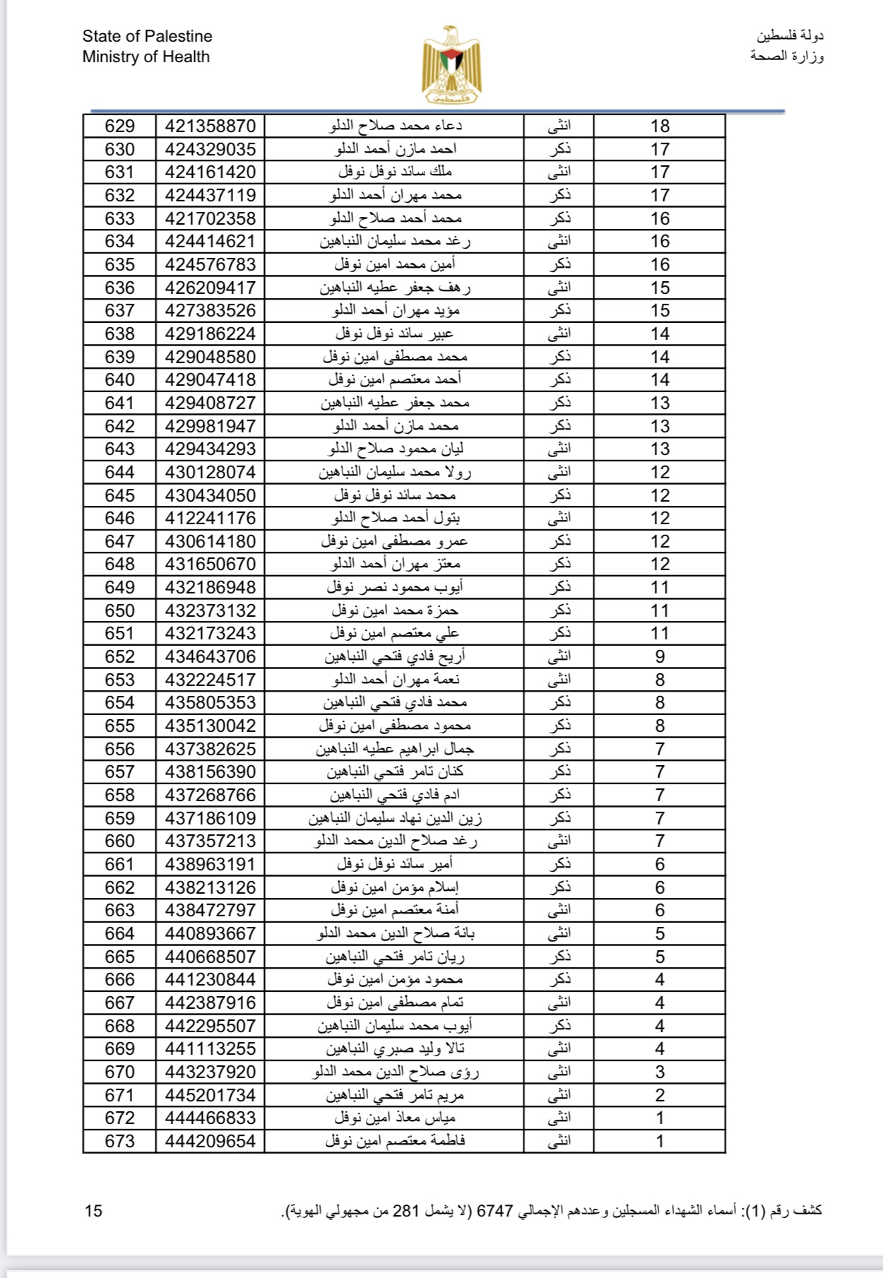 وزارة الصحة الفلسطينية تنشر أسماء شهداء غزة