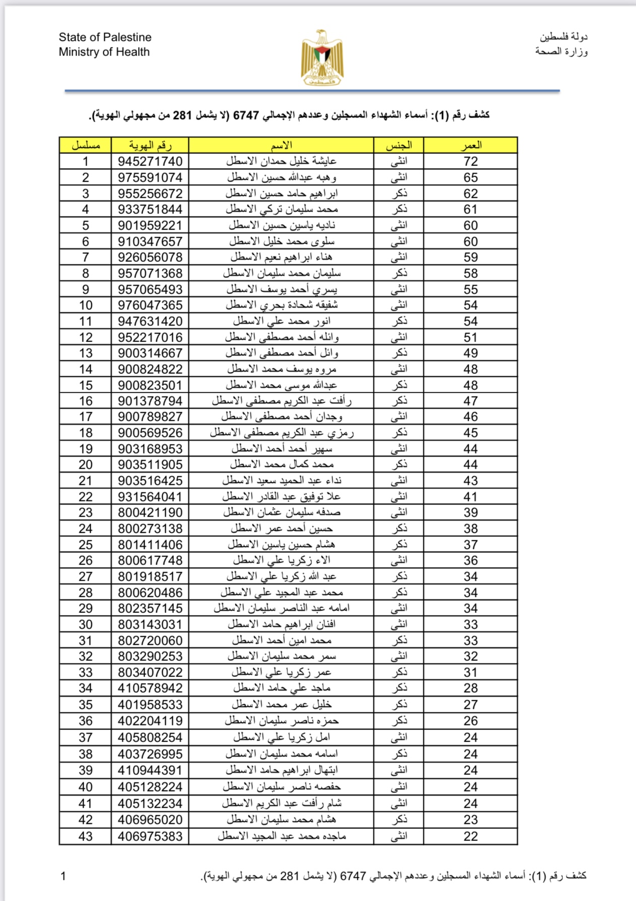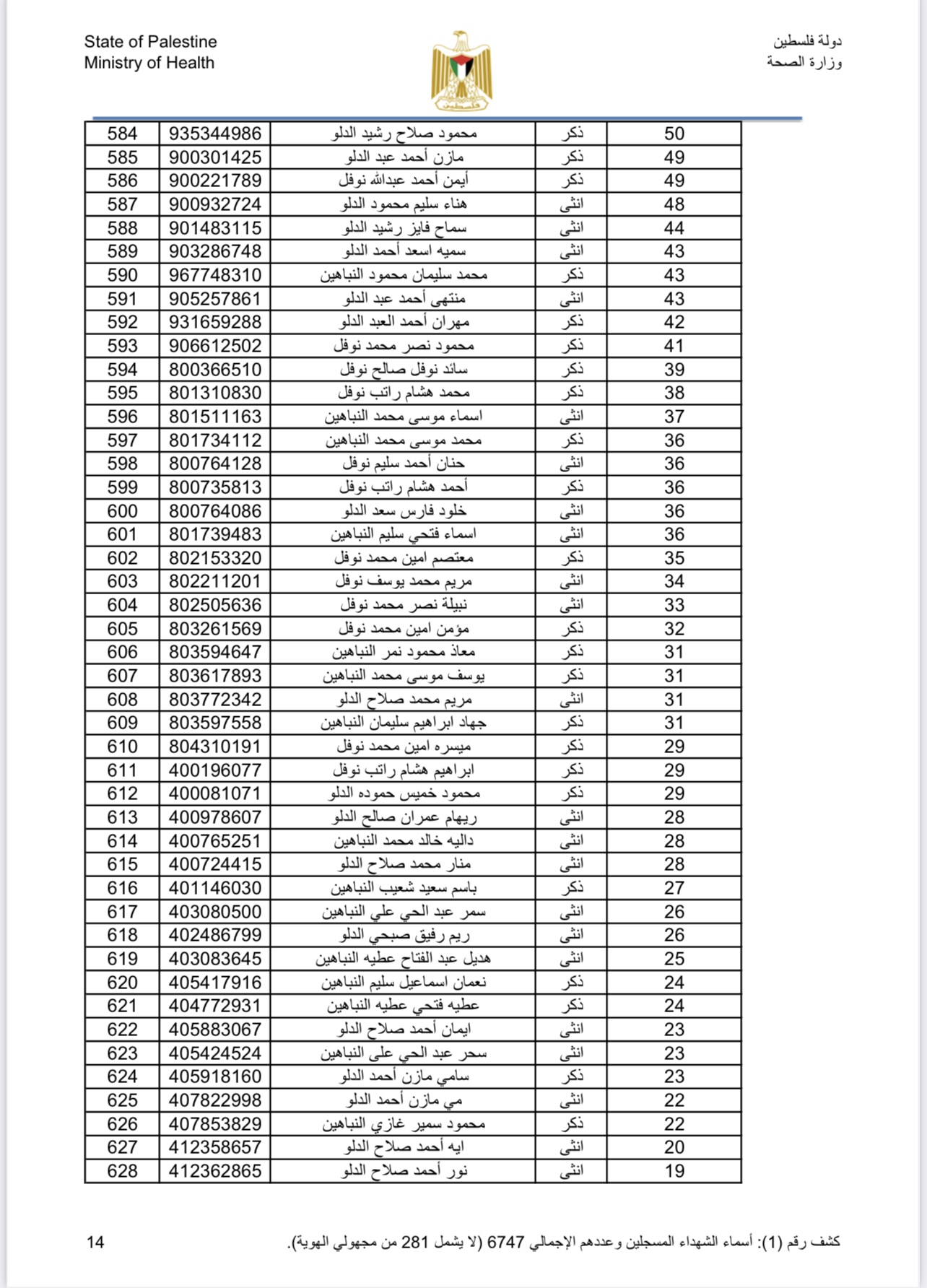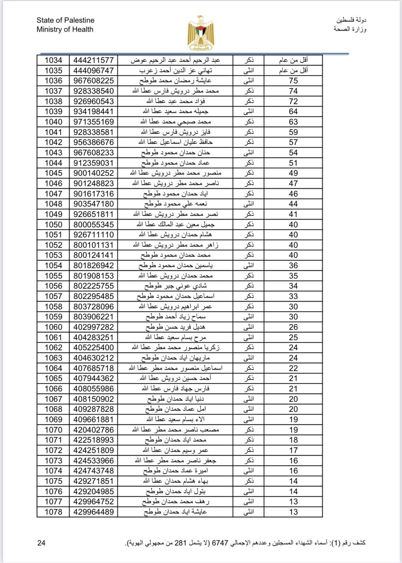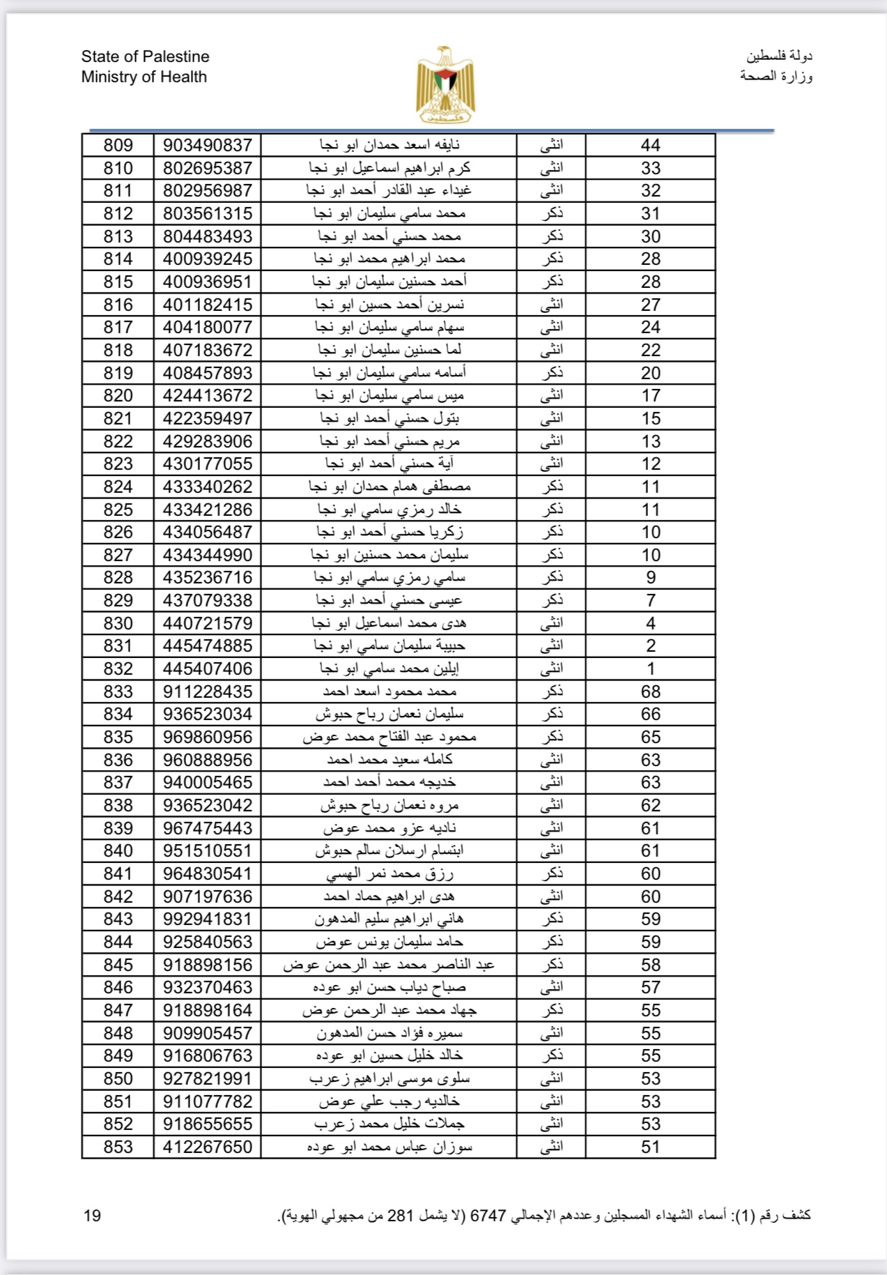 وزارة الصحة الفلسطينية تنشر أسماء شهداء غزة