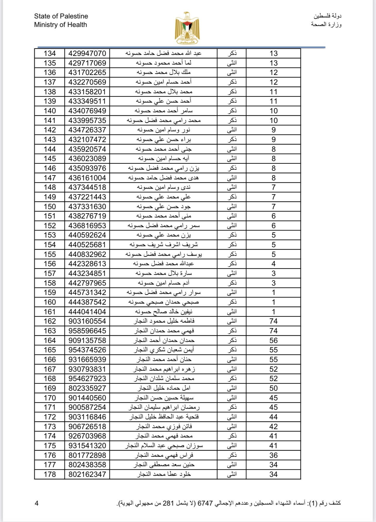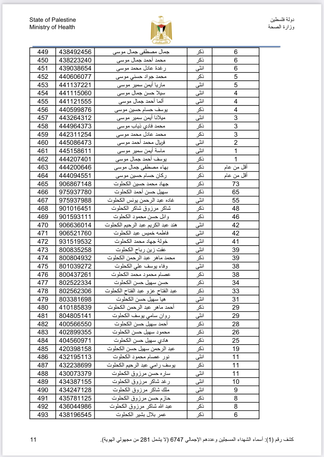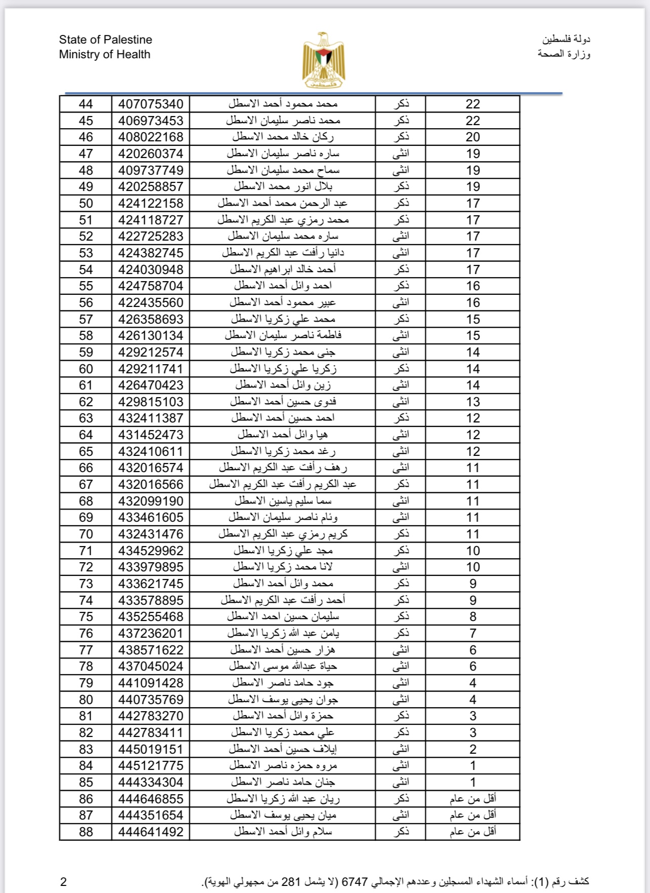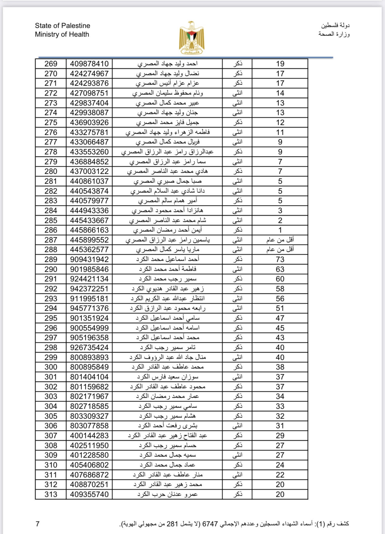 عمانيات - نشرت وزارة الصحة الفلسطينية تقريرا تفصيليّا يوثّق تفاصيل ضحايا العدوان من الشهداء، بما فيها أسماءُ جميعهم. وأوضحت أن عدد الشهداء بلغ 7028، منهم 2913 طفلًا.