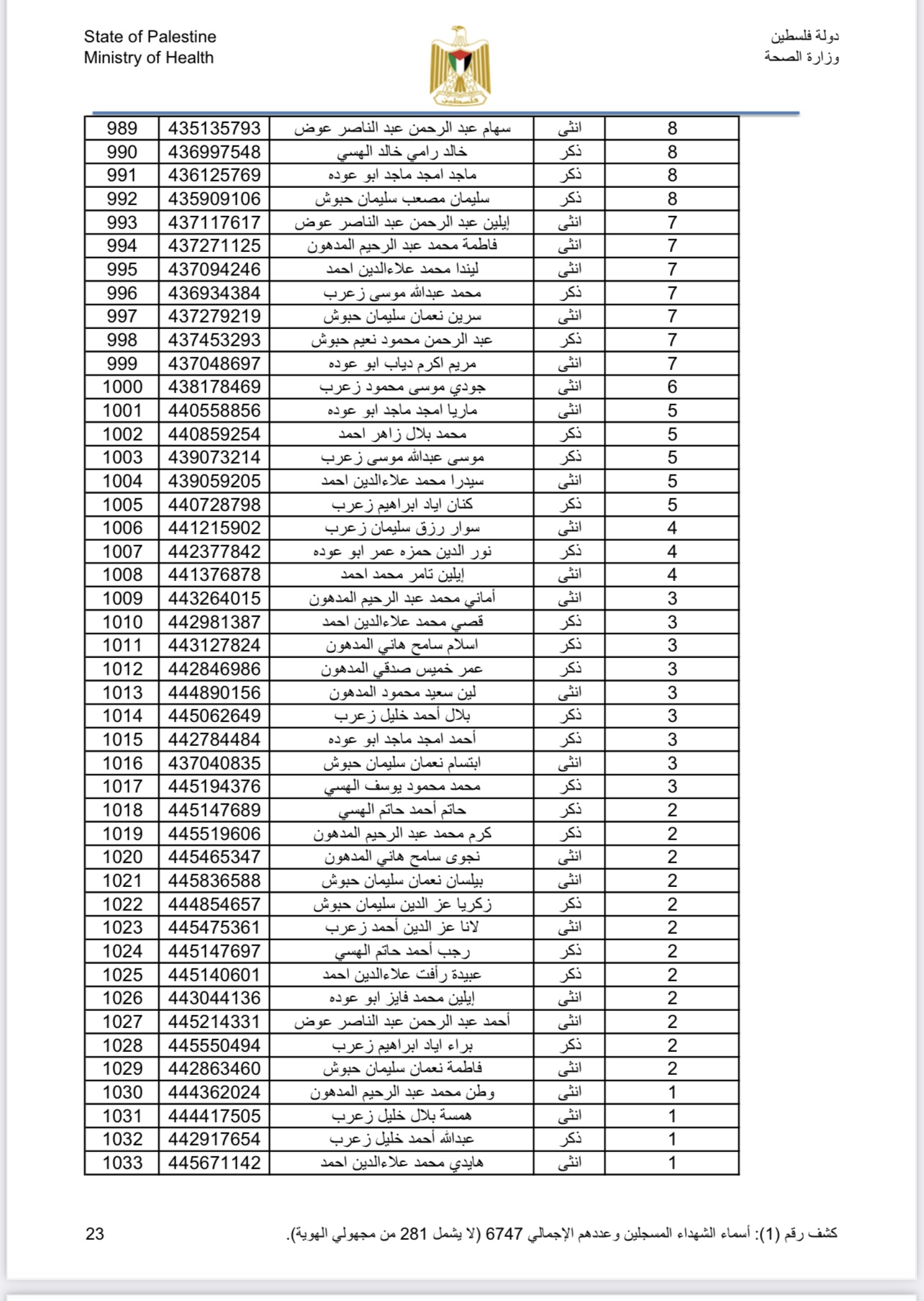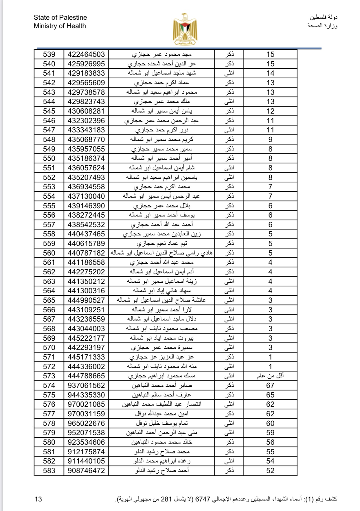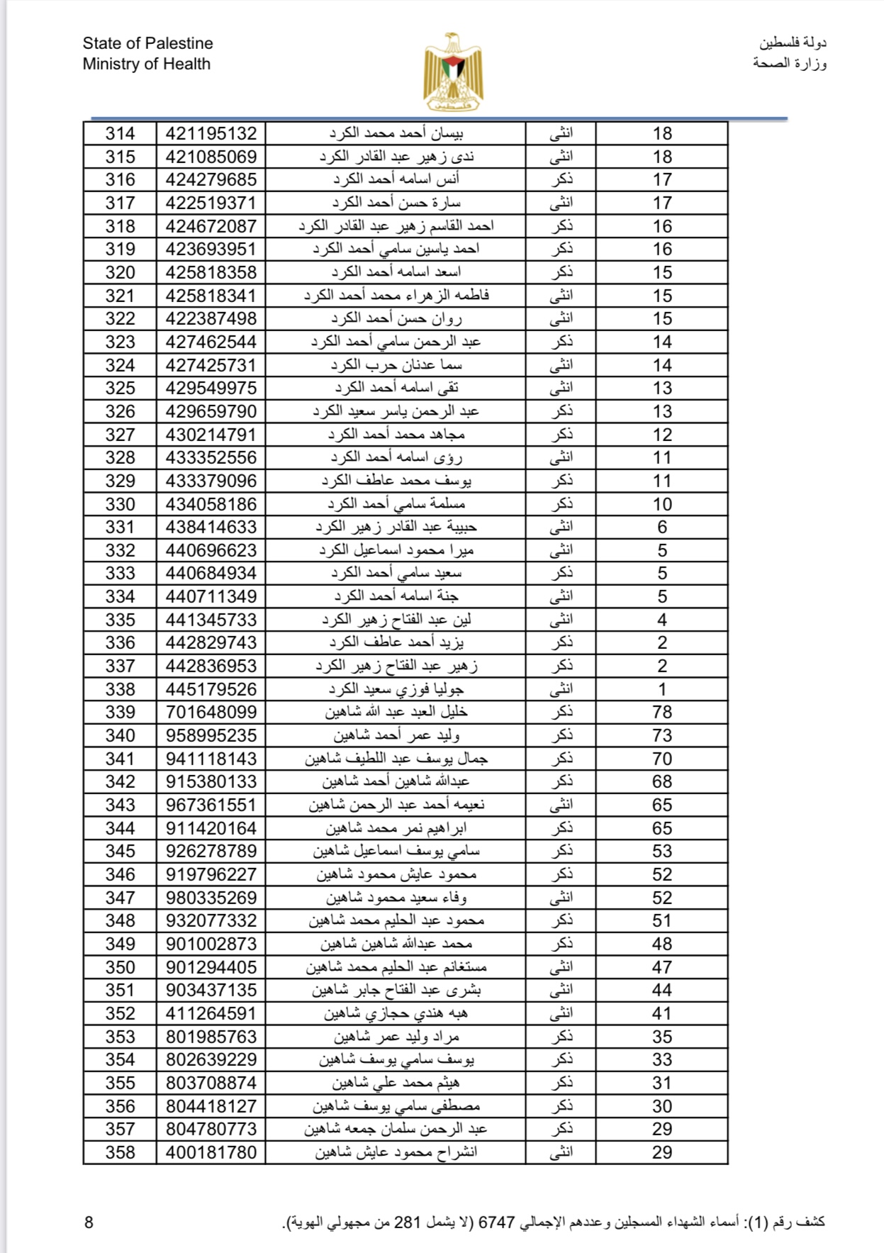 عمانيات - نشرت وزارة الصحة الفلسطينية تقريرا تفصيليّا يوثّق تفاصيل ضحايا العدوان من الشهداء، بما فيها أسماءُ جميعهم. وأوضحت أن عدد الشهداء بلغ 7028، منهم 2913 طفلًا.