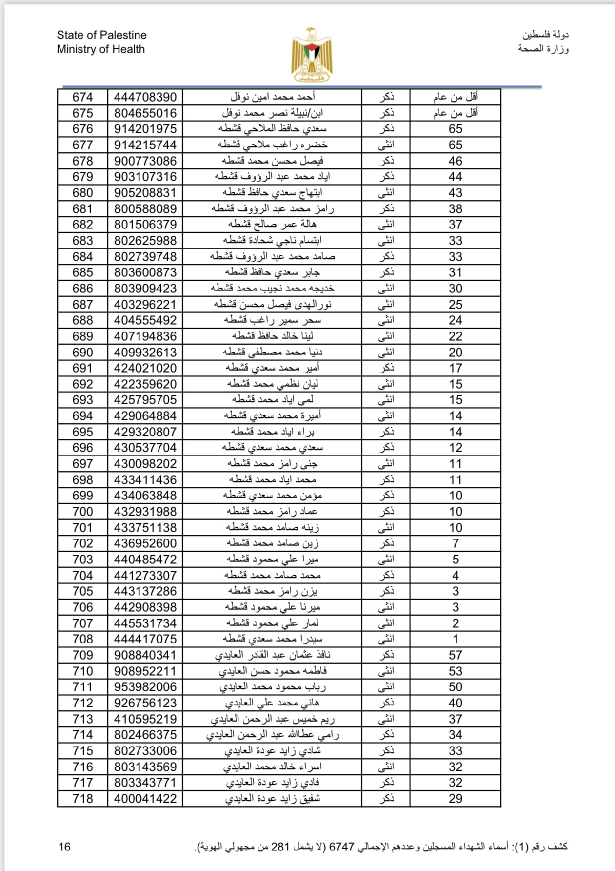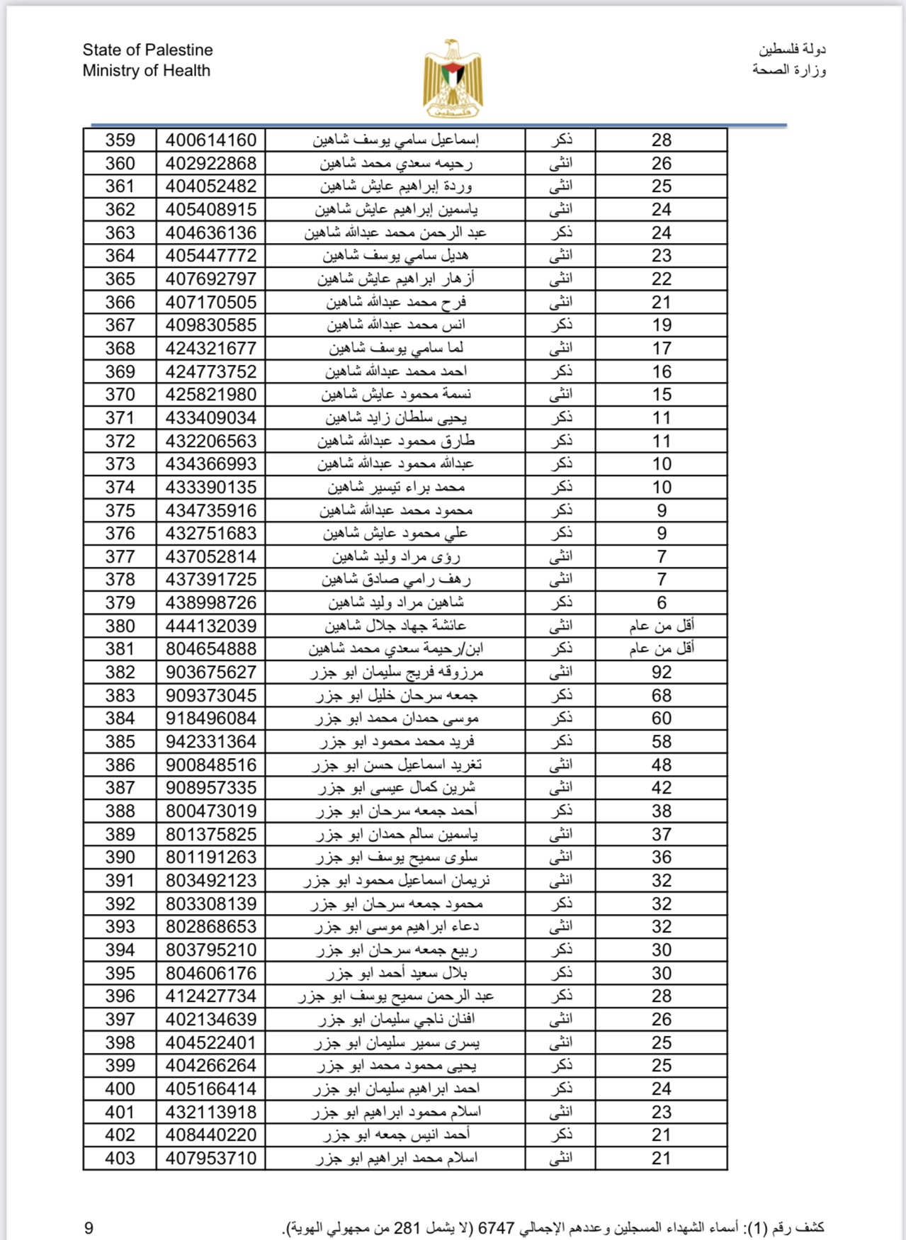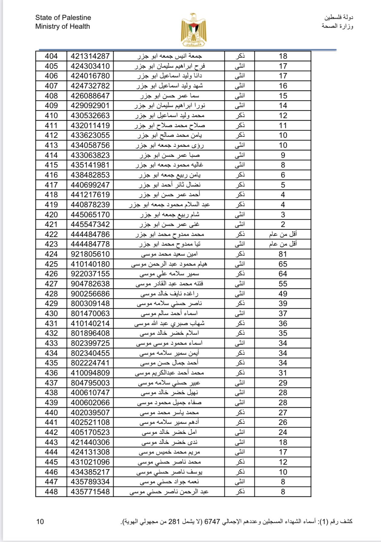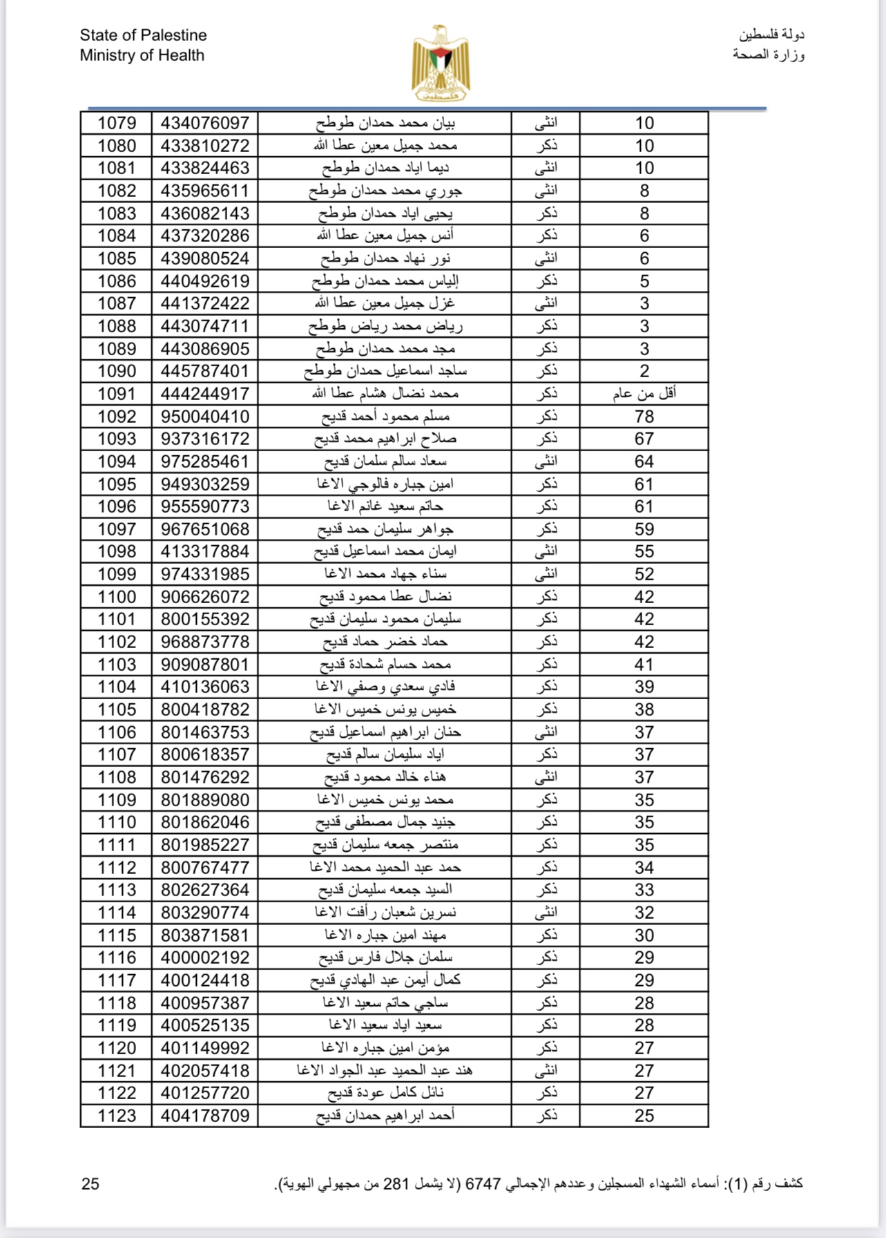 عمانيات - نشرت وزارة الصحة الفلسطينية تقريرا تفصيليّا يوثّق تفاصيل ضحايا العدوان من الشهداء، بما فيها أسماءُ جميعهم. وأوضحت أن عدد الشهداء بلغ 7028، منهم 2913 طفلًا.