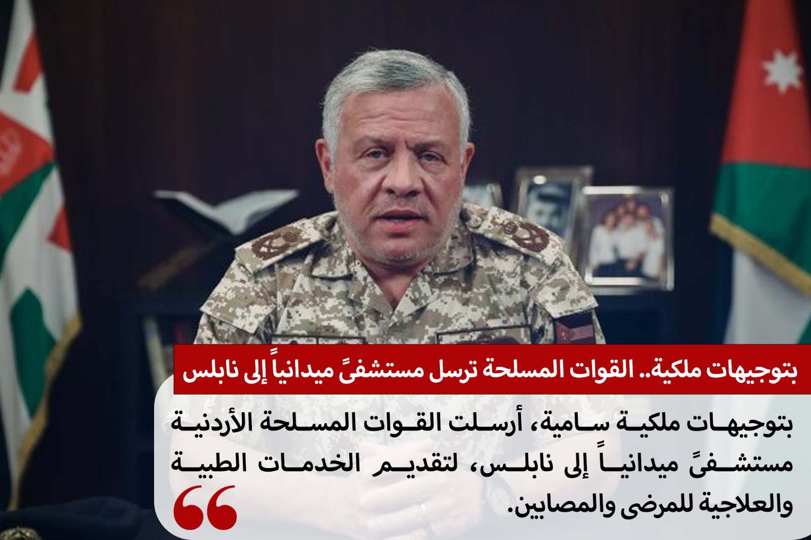 عمانيات - بتوجيهات ملكية سامية، أرسلت القوات المسلحة الأردنية مستشفىً ميدانياً إلى نابلس، لتقديم الخدمات الطبية والعلاجية للمرضى والمصابين.
