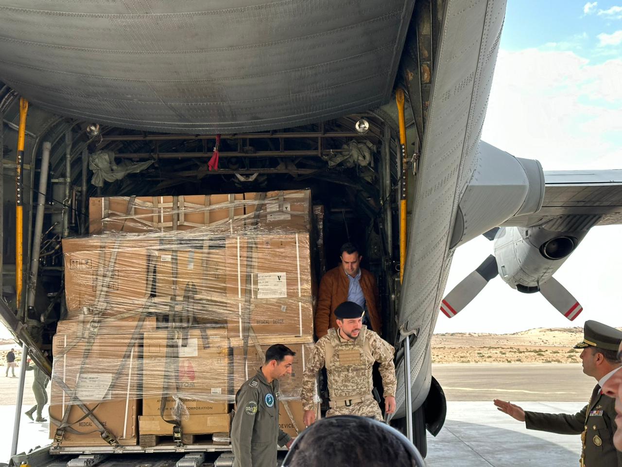 عمانيات - وصل سمو الأمير الحسين بن عبدالله الثاني، ولي العهد، إلى مطار العريش الدولي، على متن طائرة عسكرية، تابعة لسلاح الجو الملكي الأردني، تحمل على متنها فريق المستشفى، ومعدات وأجهزة طبية لتجهيز مستشفى ميداني جديد في مدينة خان يونس جنوبي قطاع غزة.