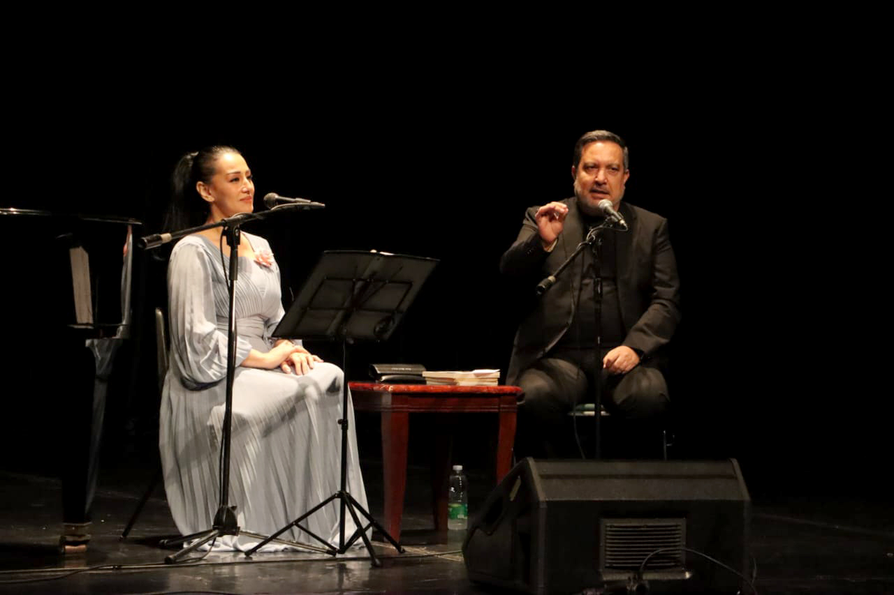 عمانيات - عانق الشاعر والإعلامي اللبناني زاهي وهبي والفنانة الأردنية غادة عباسي في حوارية مزجت بين الشعر والغناء الوطني، فلسطين وأهلها، في أمسية إبداعية نظمتها نقابة الفنانين الأردنيين ضمن فعاليات الدورة الـ38 من مهرجان جرش للثقافة والفنون مساء اليوم الخميس على المسرح الرئيس بالمركز الثقافي الملكي بعمان.