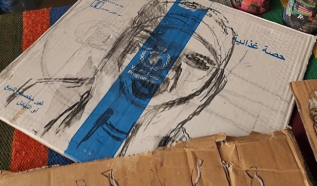 لم يجد الفنان سوى "كراتين المساعدات" المتوفرة، بديلاً عن ورق الرسم الذي نفد من القطاع منذ بداية الحرب، في ظل الحصار والقيود المشددة التي تفرضها دولة الاحتلال على إدخال المواد الأساسية والسلع والبضائع.