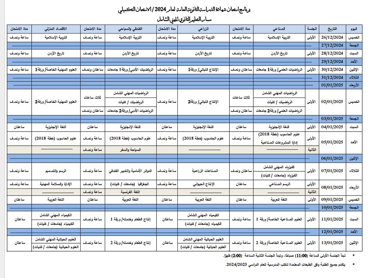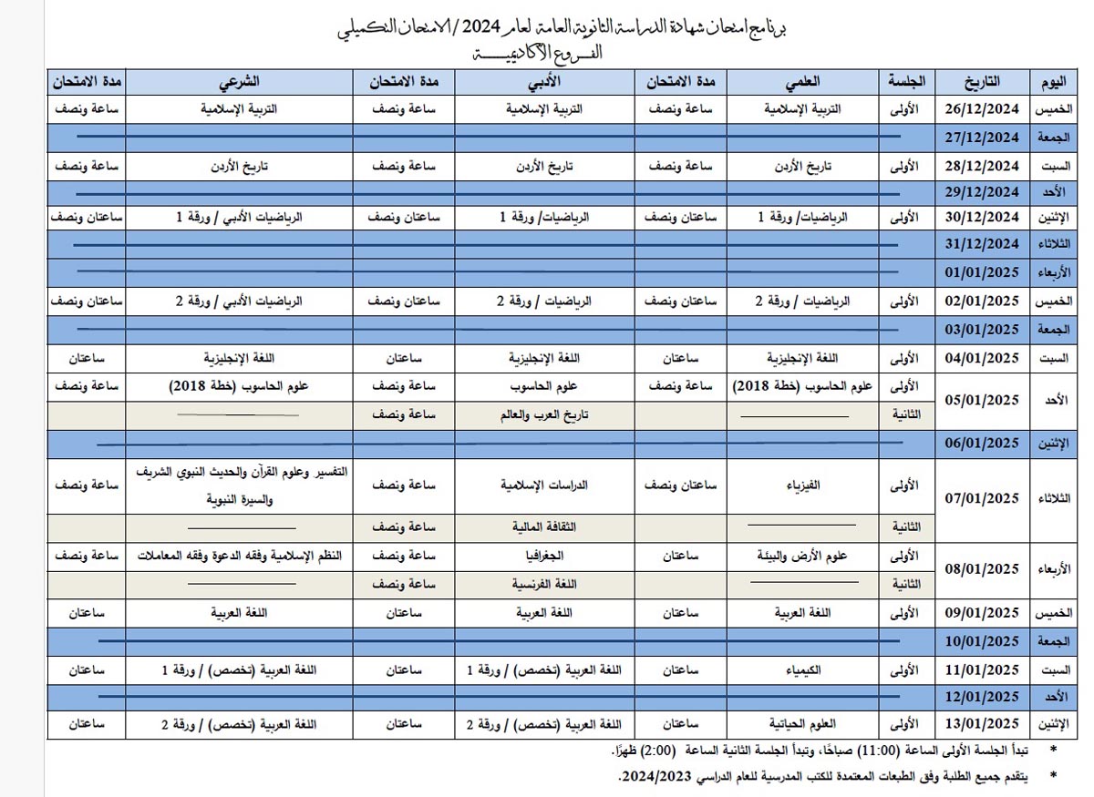 عمانيات - أعلنت وزارة التربية والتعليم اليوم الاثنين جدول امتحان شهادة الدراسة الثانوية العامة لعام 2024/ الامتحان التكميلي، وسيكون أول أيام الامتحان يوم الخميس 26 كانون الأول المقبل.