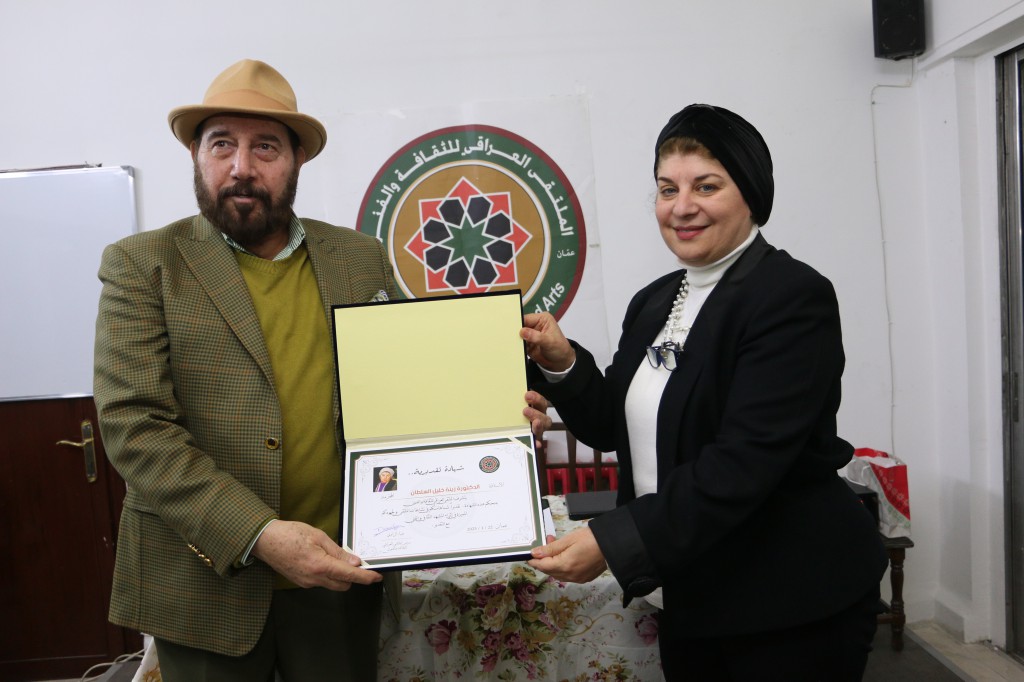 عمانيات - بمناسبة إعادة إعمار منارة الحدباء اقام الملتقى العراقي للثقافة والفنون أمسية ثقافية تاريخية استضاف فيها الدكتورة زينة خليل السلطان تحت عنوان (الأثار الإسلامية والأشورية في نينوى) مساء الأربعاء في قاعة بيت الثقافة والفنون بعمان وقد ادار الأمسية رئيس الملتقى الصحفي والباحث الفنان ضياء الراوي بحضور عدد من أعضاء الملتقى بالإضافة الى عدد من الكتاب والادباء والفنانين والاكاديميين والإعلاميين والمهتمين وفي ختام الاسية قام الراوي بتكريم الدكتورة المحاضرة بشهادة تذكارية من الملتقى .