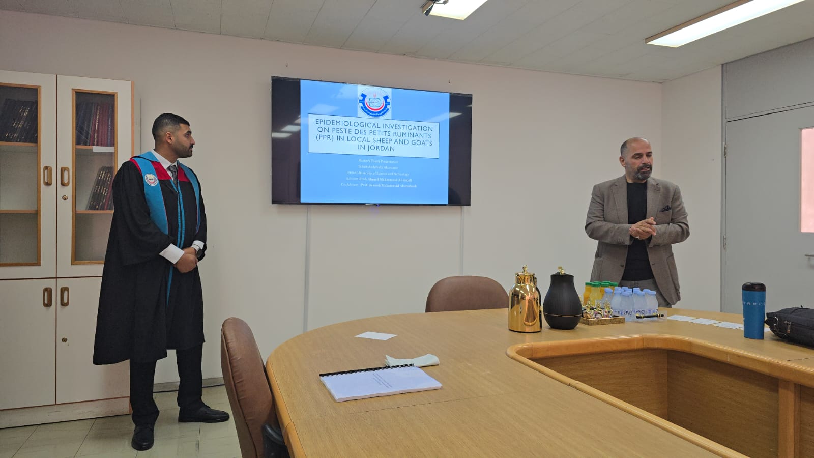 عمانيات - حصل الدكتور صهيب عبدالحفيظ ابو ناصر على درجة الماجستير في "علم الاوبئة البيطرية" من جامعة العلوم و التكنولوجيا الأردنية والموسومة بعنوان : (التحقيق الوبائي لمرض طاعون المجترات الصغيرة (PPR) في الأغنام والماعز المحلية في الأردن) .