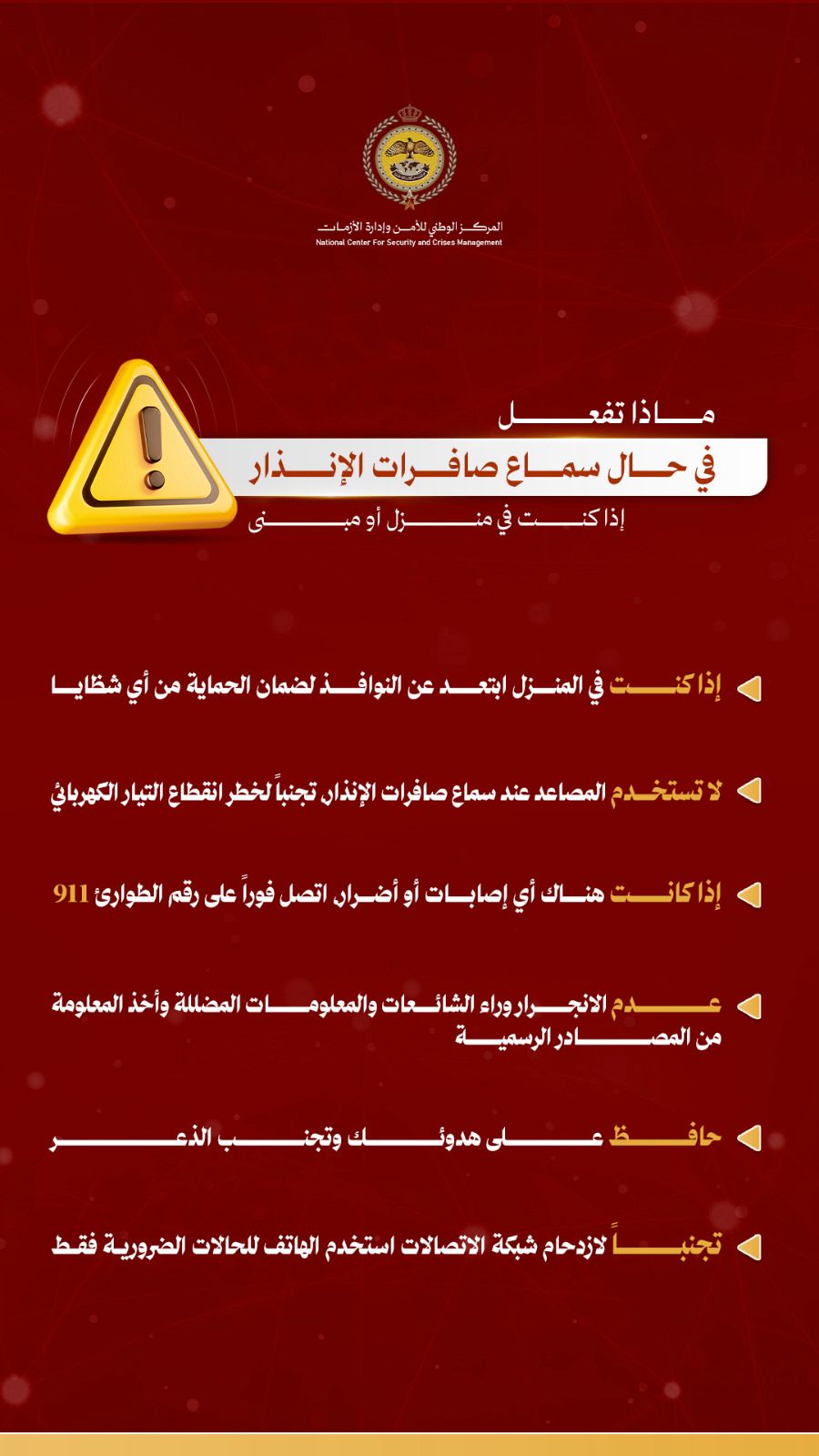- "الوطني لإدارة الأزمات" يصدر إرشادات للتعامل مع صافرات الإنذار وسقوط أجسام من الجو