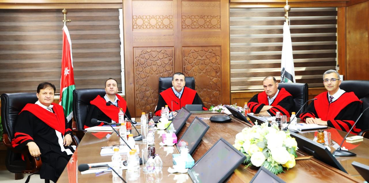 ترأّس لجنة المناقشة الأستاذ الدكتور أحمد فخري العجلوني، وضمّت في عضويتها كلاً من: الأستاذ الدكتور هيثم بني سلامة (جامعة العين)، والأستاذ الدكتور خلف ختاتنة، والدكتور أسامة الضرغام (جامعة البلقاء التطبيقية)، والممتحن الخارجي الأستاذ الدكتور ياسر إبراهيم جراروة (جامعة العلوم والتكنولوجيا الأردنية).