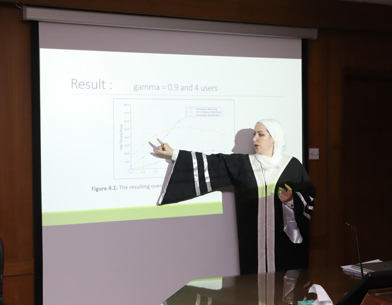 وقدمت الطالبة أبو حماد رسالتها الموسومة: “تصميم شبكات قائمة على تقنية MIMO بكفاءة طاقية: مقاربة من منظور التجميع”، والتي حظيت بإشادة أعضاء اللجنة، حيث أوصوا بإجازتها، متمنين لها المزيد من التوفيق والتميّز في مسيرتها الأكاديمية وخدمة وطنها.