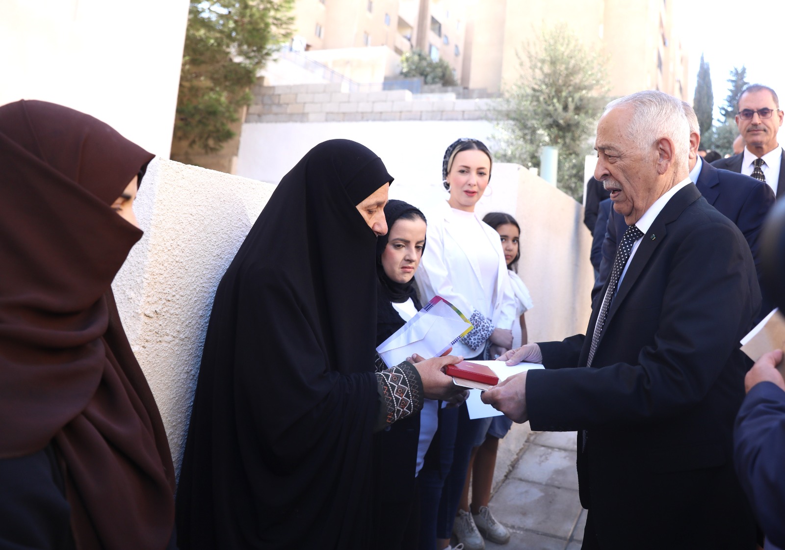 وسلّم رئيس الديوان الملكي الهاشمي يوسف حسن العيسوي، رئيس لجنة متابعة تنفيذ مبادرات جلالة الملك، مفاتيح الشقق السكنية وشهادات الانتفاع للأسر المستفيدة، بحضور وزير الأشغال العامة والإسكان المهندس ماهر أبو السمن، ووزيرة التنمية الاجتماعية وفاء بني مصطفى، ومحافظ العاصمة ياسر العدوان، ومدير عام مؤسسة الإسكان والتطوير الحضري جمانة العطيات، ومدير مكتب الأردن في هيئة الأعمال الخيرية العالمية – الإمارات العربية المتحدة رائد صبري أبو علفة.