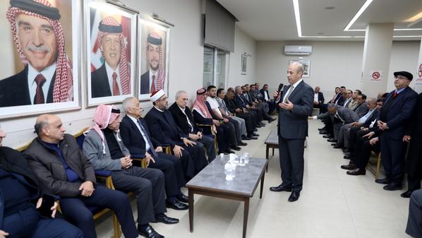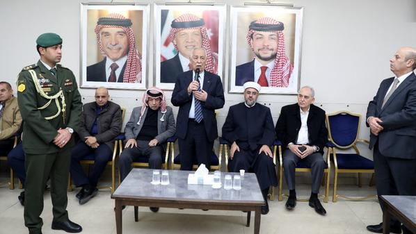 عمانيات - مندوبا عن جلالة الملك عبدالله الثاني وسمو الأمير الحسين بن عبدالله الثاني، ولي العهد، قدّم رئيس الديوان الملكي الهاشمي يوسف حسن العيسوي، اليوم الأحد، واجب العزاء إلى عشائر الربطة والدبوبي والحوراني والجعافرة، ناقلا إليهم تعازي ومواساة جلالة الملك وسمو ولي العهد.