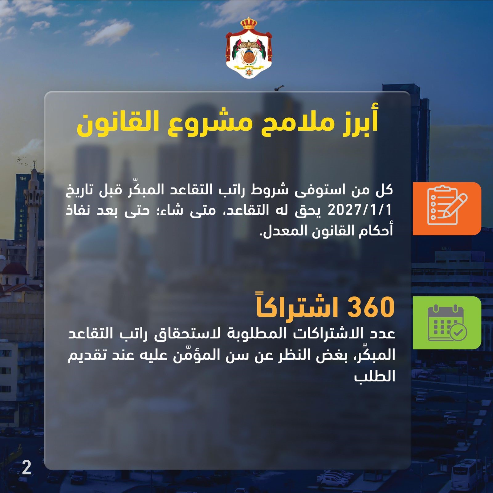 مشروع القانون ينظِّم شروط التَّقاعد بحيث يكون التَّقاعد الوجوبي هو الأساس، والمبكِّر هو الاستثناء؛ تحقيقاً لاستدامة النِّظام التأميني والحفاظ على حقوق المؤمَّن عليهم.