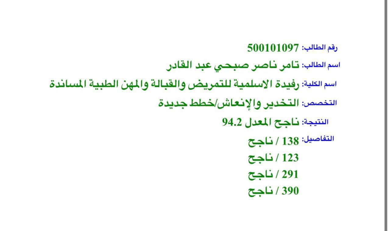 حصل الطالب تامر ناصر صبحي عبد القادر على المرتبة الاولى في الدورة الشتوية للامتحان الشامل في تخصص التخدير والإنعاش من كلية رفيدة الاسلمية للتمريض والقبالة بمعدل 94.2
