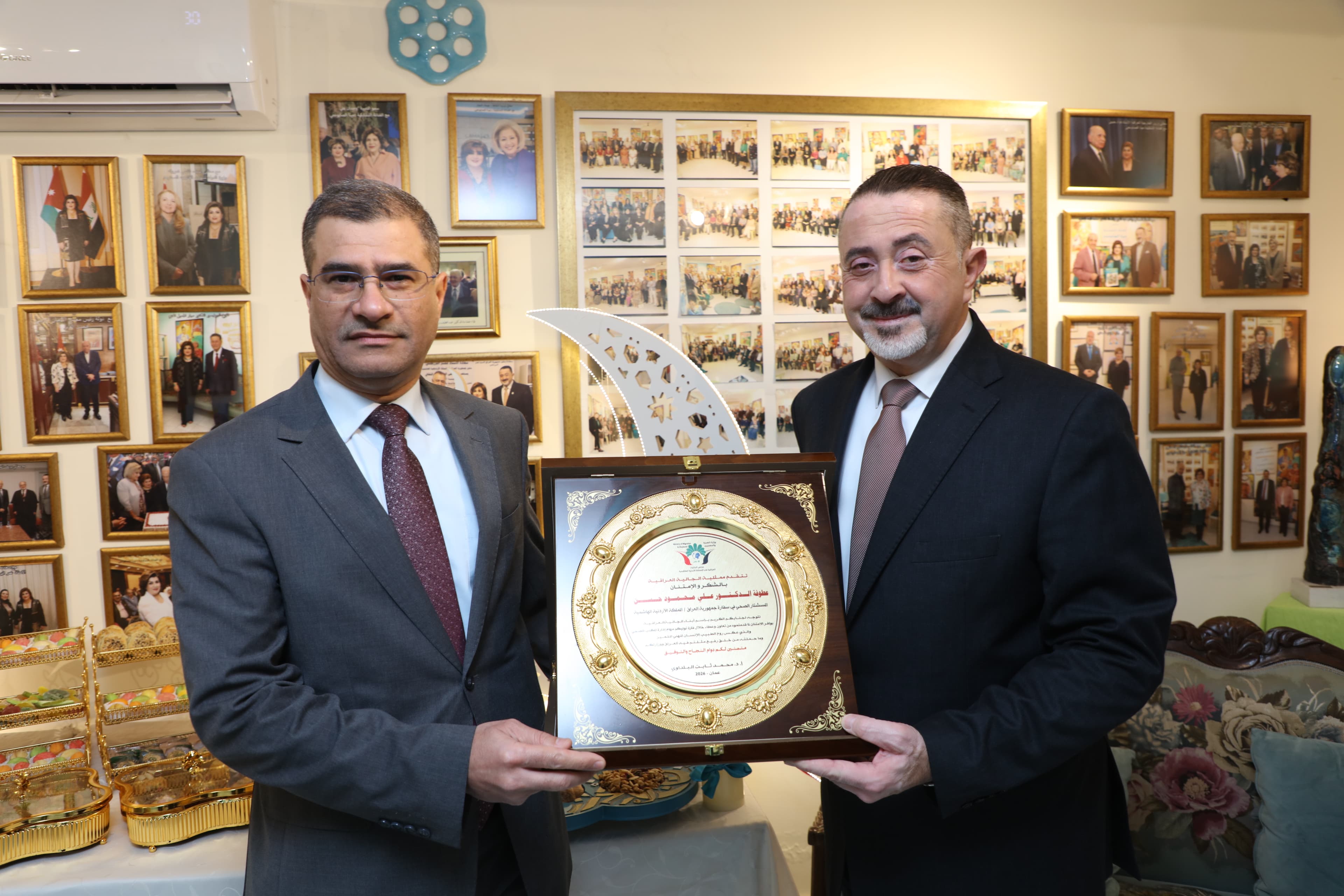 شهدت الأمسية تكريم عطوفة الدكتور علي محمود الملحق الصحي العراقي في سفارتنا بمناسبة انتهاء مهامه في الأردن، حيث قدم باسم الجالية درع تقديري عرفاناً بجهوده وعطائه خلال فترة عمله.