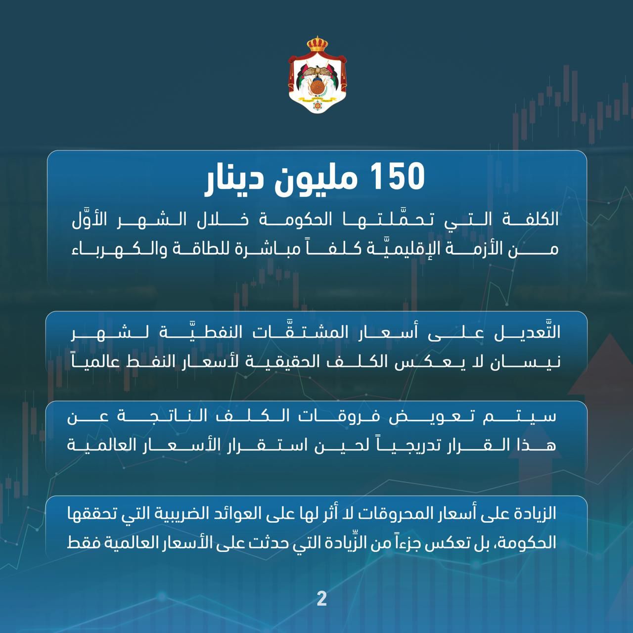 وستقوم الحكومة بتعويض فروقات الكلف الناتجة عن هذا القرار تدريجيا لحين استقرار الأسعار العالمية، مع الإشارة إلى أن الحكومة تحملت خلال الشهر الأول من الأزمة الإقليمية كلفا مباشرة للطاقة والكهرباء بسبب الأحداث الإقليمية بلغت حتى الآن قرابة 150 مليون دينار.