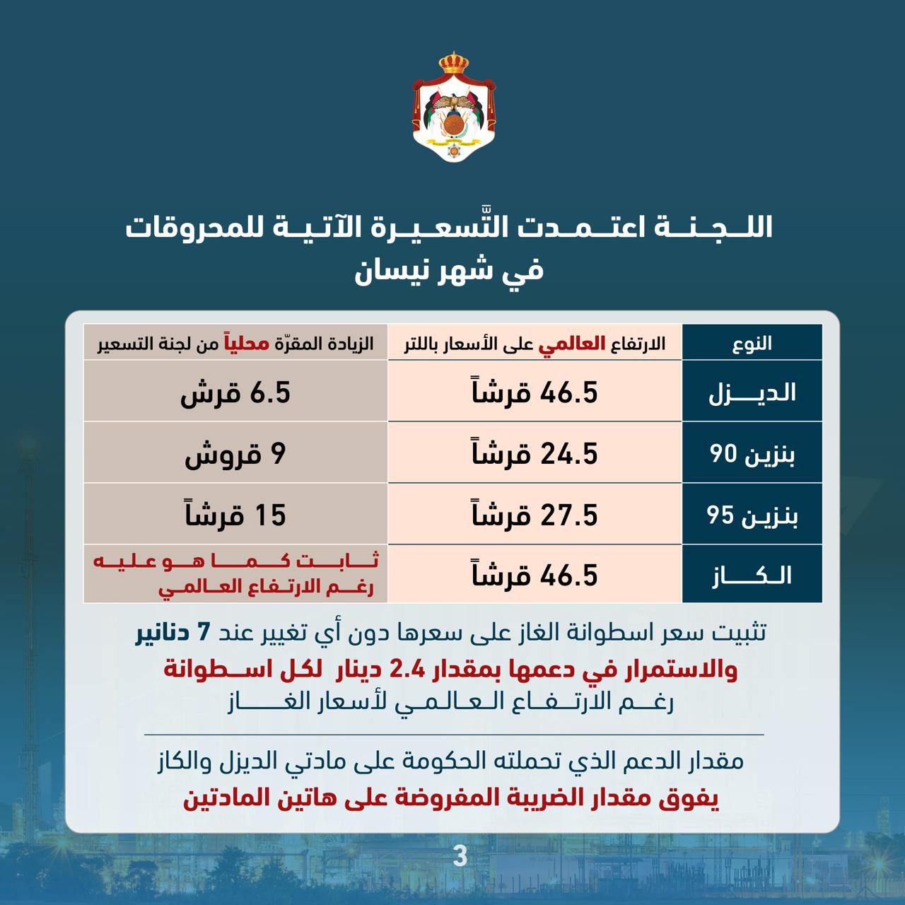 واستنادا لسياسة الحكومة في التدرج في عكس ارتفاعات الأسعار العالمية للمشتقات النفطية التي تستهدف احتواء الارتفاعات على أسعار البيع المحلية للحد من آثارها المباشرة على المواطنين والقطاعات الاقتصادية، قررت اللجنة التعديل على أسعار البيع المحلية للمشتقات النفطية لشهر نيسان بشكل لا يعكس الكلف الحقيقية للأسعار العالمية.