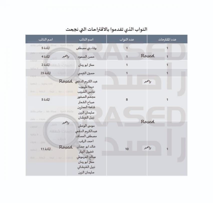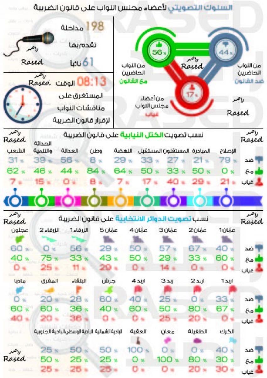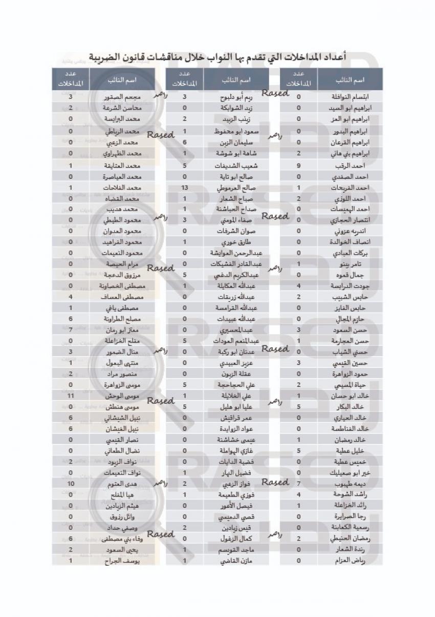 كما عمل راصد على تتبع مداخلات النواب خلال جلسة اقرار المشروع المعدل لقانون الضريبة، حيث بينت النتائج أن النواب قدموا خلال الجلسات الأربع التي عقدها على مدار يومي عمل 198 مداخلة على مواد القانون، حيث كانت المادة 7 أكثر المواد نقاشاً والتي قدم النواب عليها 34 مداخلة، ثم المادة الخامسة والتي قدموا عليها 22 مداخلة، وتحدث خلال يومي العمل ما مجموعه (61) نائباً منهم من قدم مداخلة لمرة واحدة ومنهم من قدم أكثر من مداخلة، وكان النائب صالح العرموطي الأكثر تقديماً للمداخلات ب13 مداخلة ثم النائب موسى الوحش بعدد وصل إلى 11 مداخلة، ومرفق جدول يوضح أسماء النواب الذين قدموا مداخلات خلال المناقشات، ومن الجدير ذكره أن النواب قدموا مجموعة من المقترحات منها ما تم التصويت عليه ومنها ما لم يتم التصويت عليه، حيث نجح المجلس بتمرير 6 مقترحات تقدم بها 22 نائباً، وقد كانت 4مقترحات من قبل نواب فرديين، فيما اجتمع 8نواب على مقترح آخر، و10نواب على مقترح آخر.