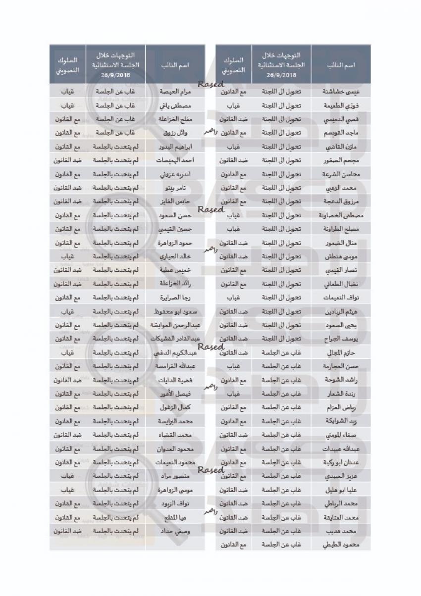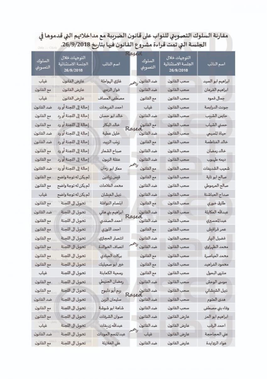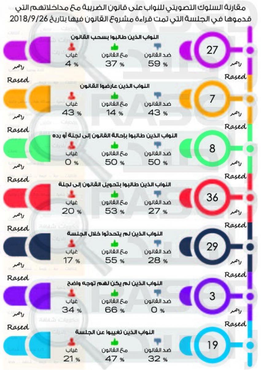 وعمل راصد على مقارنة السلوك التصويتي على القانون لكل لنائب، من خلال المقارنة بين ما مداخلته خلال الجلسة الأولى التي تم بها قراءة القانون والتي أجريت بتاريخ 2692018والتي صوت بها النواب على تحويل مشروع القانون إلى لجنة الاقتصاد والاستثمار والسلوك التصويتي له على مجمل قانون الضريبة، ففي حين أن 25 نائباً تقدموا بمداخلات تم الاستدلال من خلالها على رغبتهم بسحب القانون، قام (37%) منهم بالتصويت مع القانون فيما صوت ما نسبته (59%) منهم مع رفض القانون، وتغيب عن التصويت ما نسبته (4%) منهم، وفي حين عارض 7نواب من خلال مداخلاتهم على القانون في القراءة الأولى قام (14%) منهم بالتصويت مع إقرار القانون، فيما رفضه ما نسبته (43%) منهم، وتغيب عن التصويت على القانون بمجمله (43%) منهم، أما النواب الذين كانوا مع تحويل مشروع القانون إلى اللجنة المعنية والذين بلغ عددهم 36 نائباً، فقد قام (53%) منهم بالتصويت مع إقرار القانون، فيما رفضه (27%) منهم، وتغيب عن التصويت عليه (20%) منهم، أما النواب الذين طالبوا بإحالة مشروع القانون إلى اللجنة أو رده والذين بلغ عددهم 8نواب فقد صوت منهم (4) نواب مع إقرار القانون و (4) نواب مع رفضه، ويبين الجدول المرفق مقارنة السلوك التصويتي مع مداخلات النواب في تلك الجلسة.