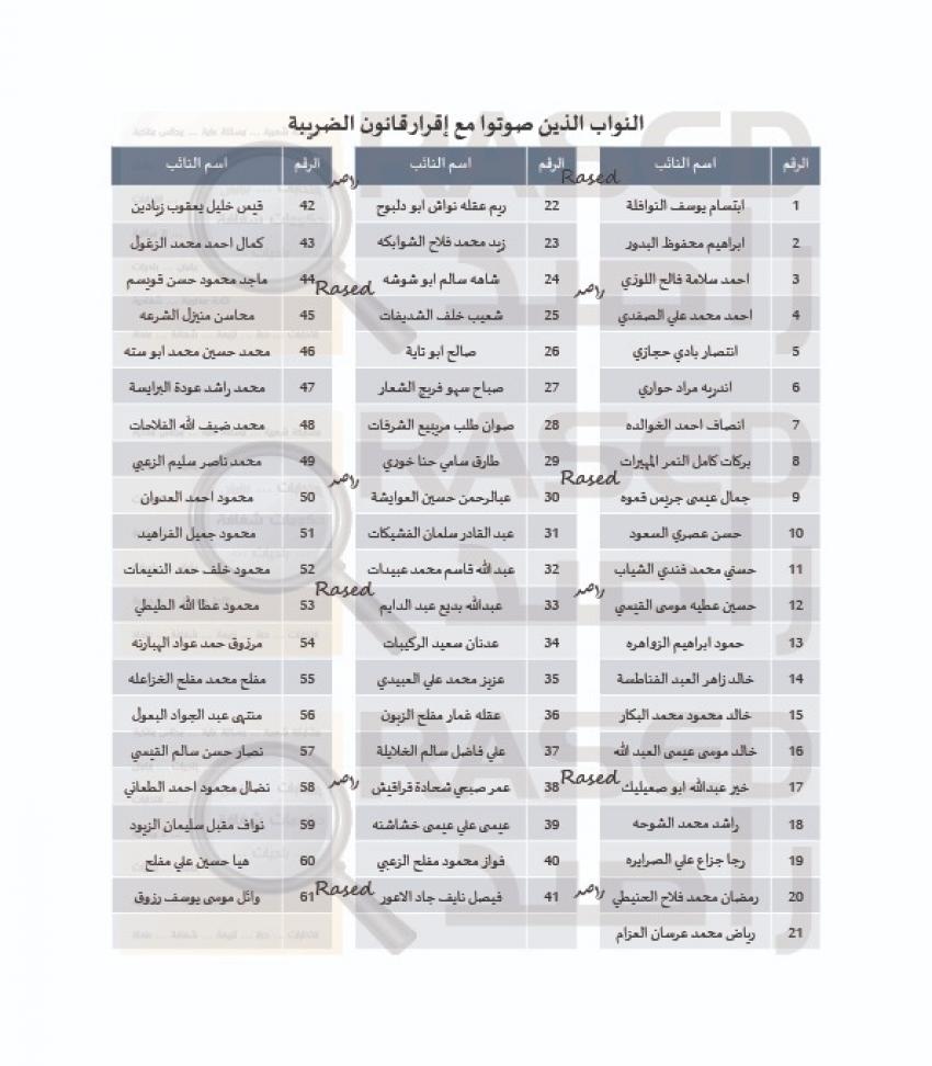 إيماناً بضرورة تكريس الشفافية في العمل البرلماني وإطلاع القواعد الانتخابية على سلوك ممثليهم داخل مجلس النواب، وبالارتكاز على أهمية الحد من تدفق المعلومات الخاطئة التي من شأنها أن تؤثر على أداء البرلمانيين والبرلمانيات، وبناء انطباعات خاطئة عن سلوكهم داخل البرلمان، مع إيماننا الكامل بأن للنواب الحق في اختيار سلوكهم التصويتي والذي يعبر عن توجهاتهم السياسية وقناعاتهم تجاه التشريعات، وإيماناً من راصد بدورِه الوطني والمهني عمِلَ راصد على تتبع مسيرة مشروع القانون المعدل لقانون ضريبة الدخل منذ سحبه من مجلس النواب وحتى إقراره من قبل مجلس النواب، حيث تظهر المراقبة أن مشروع القانون الذي احالته الحكومة الى مجلس النواب في الأسبوع الأخير من شهر أيول الماضي خلال الدورة الاستثنائية الثانية، تم مناقشته في جلسة عامة لأعضاء مجلس النواب عقدت بتاريخ 2692018حيث تم إحالته خلال الجلسة إلى اللجنة المختصة وهي لجنة الاقتصاد والاستثمار، والتي قدمت توصياتها بتاريخ 11112018إلى مجلس النواب، وبناءً عليه تمت الدعوة لعقد جلسة للنواب بتاريخ 14112018، وتم استكمالها بتاريخ 18112018، وتم خلالها إقرار قانون الضريبة بنسبة وصلت إلى 56%من مجموع الحاضرين في الجلسة والذي بلغ عددهم 108نواب من أصل 130نائباً، فيما تم رفض القانون من قبل 44%من مجموع الحاضرين، وتغيب عن التصويت 21نائباً أي ما نسبته 16%من مجموع أعضاء مجلس النواب.