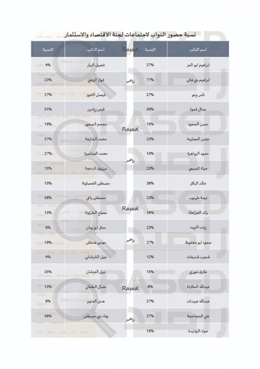 وبما يتعلق بحضور النواب لاجتماعات لجنة الاقتصاد والاستثمار تبين أن عدد النواب الذي حضروا اجتماع أو أكثر من خارج أعضاء اللجنة وصل عددهم إلى 39نائباً، وكان النائب ابراهيم بني هاني الأكثر حضوراً لاجتماعات اللجنة بنسبة وصلت إلى 77% من مجموع الاجتماعات، تلاه النائب مصطفى ياغي بنسبة وصلت 58% من مجموع الاجتماعات، تلاه النائب جمال قموة بنسبة حضور وصلت إلى 50%من مجموع الاجتماعات، وتلاه النائب وفاء بني مصطفى بنسبة حضور 46%من مجموع الاجتماعات، والنائب خالد البكار الذي وصلت نسبة حضوره إلى 38%من مجموع الاجتماعات.
