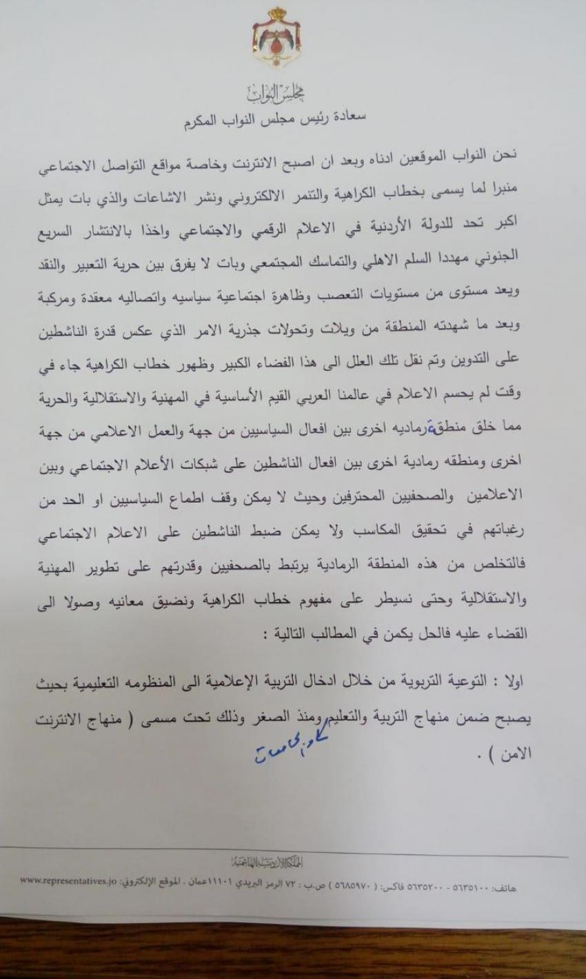 نحن النواب الموقعين ادناه وبعد ان اصبح الانترنت وخاصة مواقع التواصل الاجتماعي منبرا لما يسمى بخطاب الكراهية والتنمر الالكتروني ونشر الاشاعات والذي بات يمثل اكبر تحد للدولة الأردنية في الاعلام الرقمي والاجتماعي واخذا بالانتشار السريع الجنوني مهددا السلم الاهلي والتماسك المجتمعي وبات لا يفرق بين حرية التعبير والنقد ويعد مستوى من مستويات التعصب وظاهرة اجتماعية سياسيه واتصاليه معقدة ومركبة وبعد ما شهدته المنطقة من ويلات وتحولات جذرية الامر الذي عكس قدرة الناشطين على التدوين وتم نقل تلك العلل الى هذا الفضاء الكبير وظهور خطاب الكراهية جاء في وقت لم يحسم الاعلام في عالمنا العربي القيم الأساسية في المهنية والاستقلالية والحرية مما خلق منطق رماديه اخرى بين افعال السياسيين من جهة والعمل الاعلامي من جهة اخرى ومنطقه رمادية اخرى بين افعال الناشطين على شبكات الأعلام الاجتماعي وبين الاعلامين والصحفيين المحترفين وحيث لا يمكن وقف اطماع السياسيين او الحد من رغباتهم في تحقيق المكاسب ولا يمكن ضبط الناشطين على الاعلام الاجتماعي فالتخلص من هذه المنطقة الرمادية يرتبط بالصحفيين وقدرتهم على تطوير المهنية والاستقلالية وحتى نسيطر على مفهوم خطاب الكراهية ونضيق معانيه وصولا الى القضاء عليه فالحل يكمن في المطالب التالية :