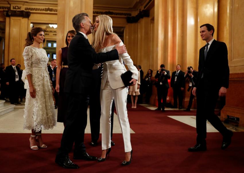 وفي وقت لاحق، ارتدت إيفانكا بلوزة وبنطلون من اللون الأبيض، واعتمدت حقيبة يد صغيرة وحذاءا أسود، وذلك خلال استقبالها مع زوجها من قبل الرئيس الأرجنتيني ماوريسيو ماكري وزوجته جوليانا عواضة لدى وصولهما إلى مسرح كولون لحضور حفل في بوينس آيرس.