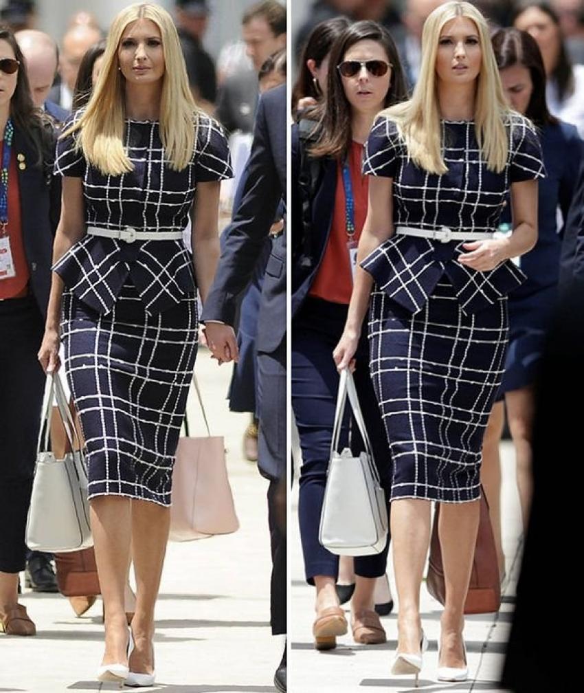 وارتدت إيفانكا البالغة من العمر 37 عاما، فستانا أسود عليه نقوشات بيضاء، واعتمدت في إطلالتها على حقيبة يد وحذاء أبيض من الجلد، ليكون هناك تناسق جميل، خاصة أنها تتمتع بجسم ممشوق وقامة طويلة.