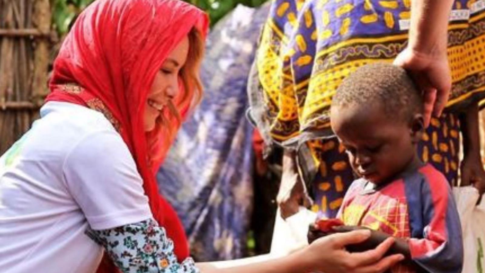 الممثلة التركية غمزة أوزجليك مع أحد الأطفال أثناء تقديم المساعدات في أفريقيا (انستغرام)