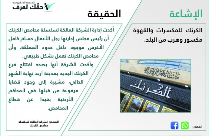 ونفت الشركة، عبر منصة "حقك تعرف" اشاعة متداولة تفيد بأن "الكرنك للمكسرات والقهوة مكسور وهرب من البلد".