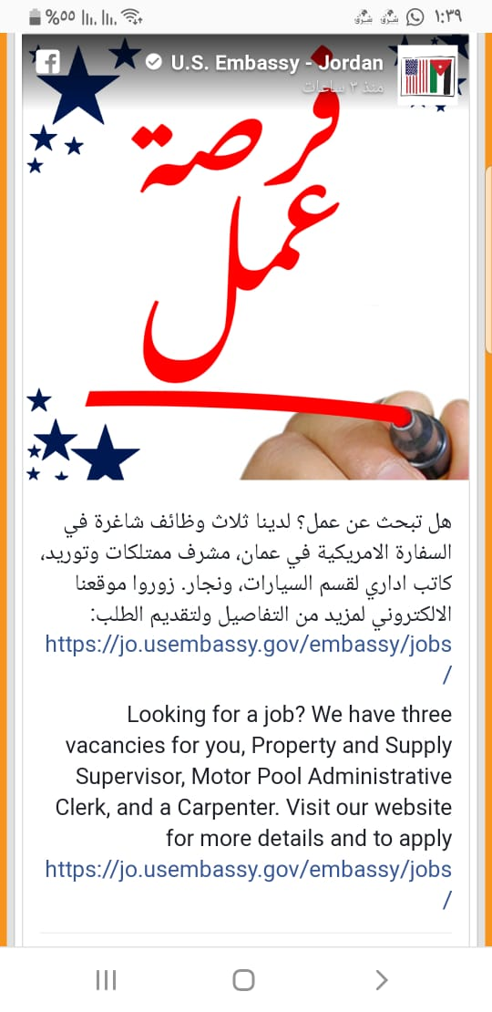 وكتبت الإعلان باللغتين العربية والإنجليزية "هل تبحث عن عمل؟ لدينا ثلاث وظائف شاغرة في السفارة الامريكية في عمان، مشرف ممتلكات وتوريد، كاتب اداري لقسم السيارات، ونجار".