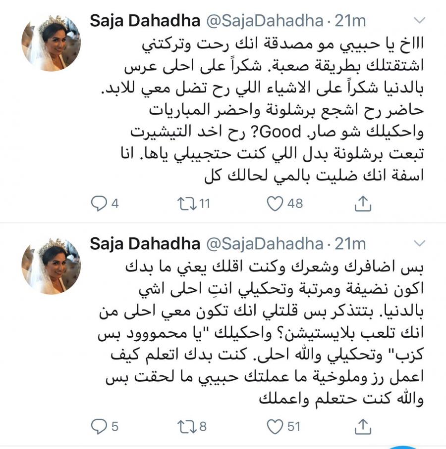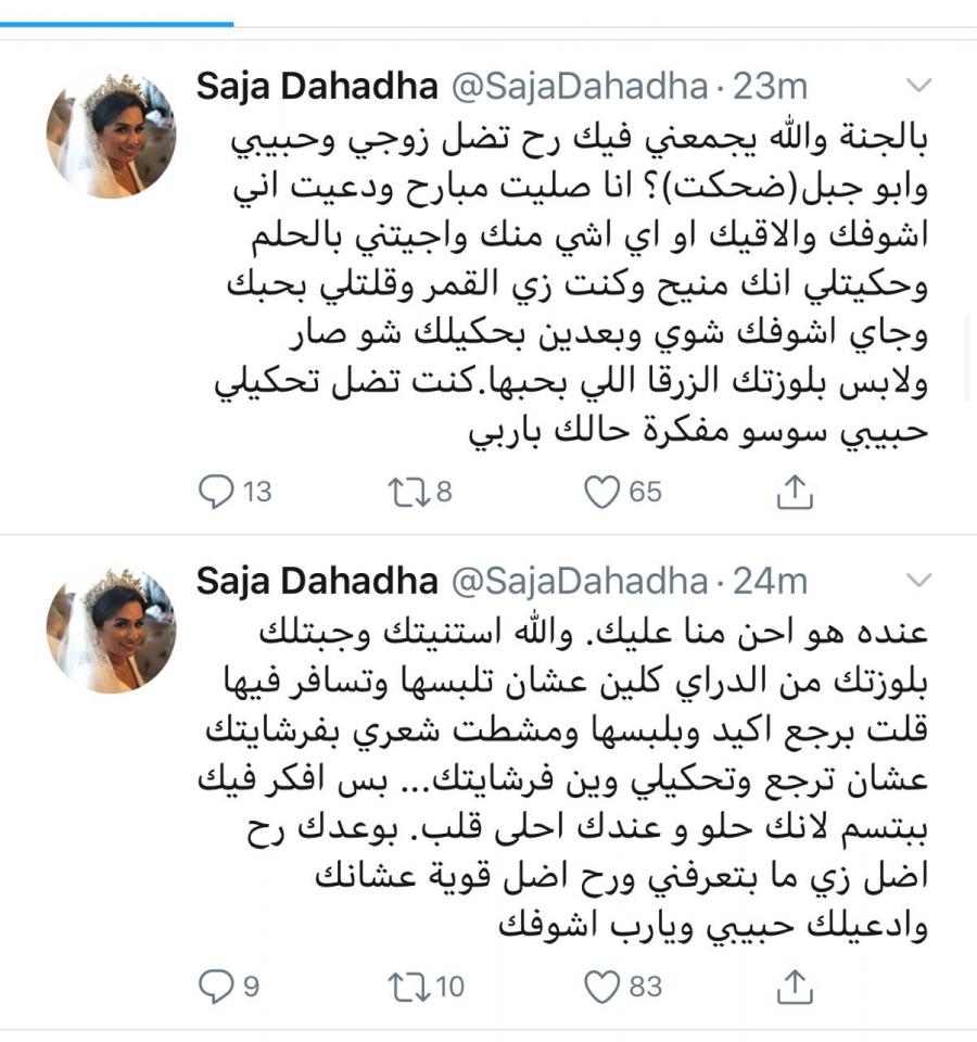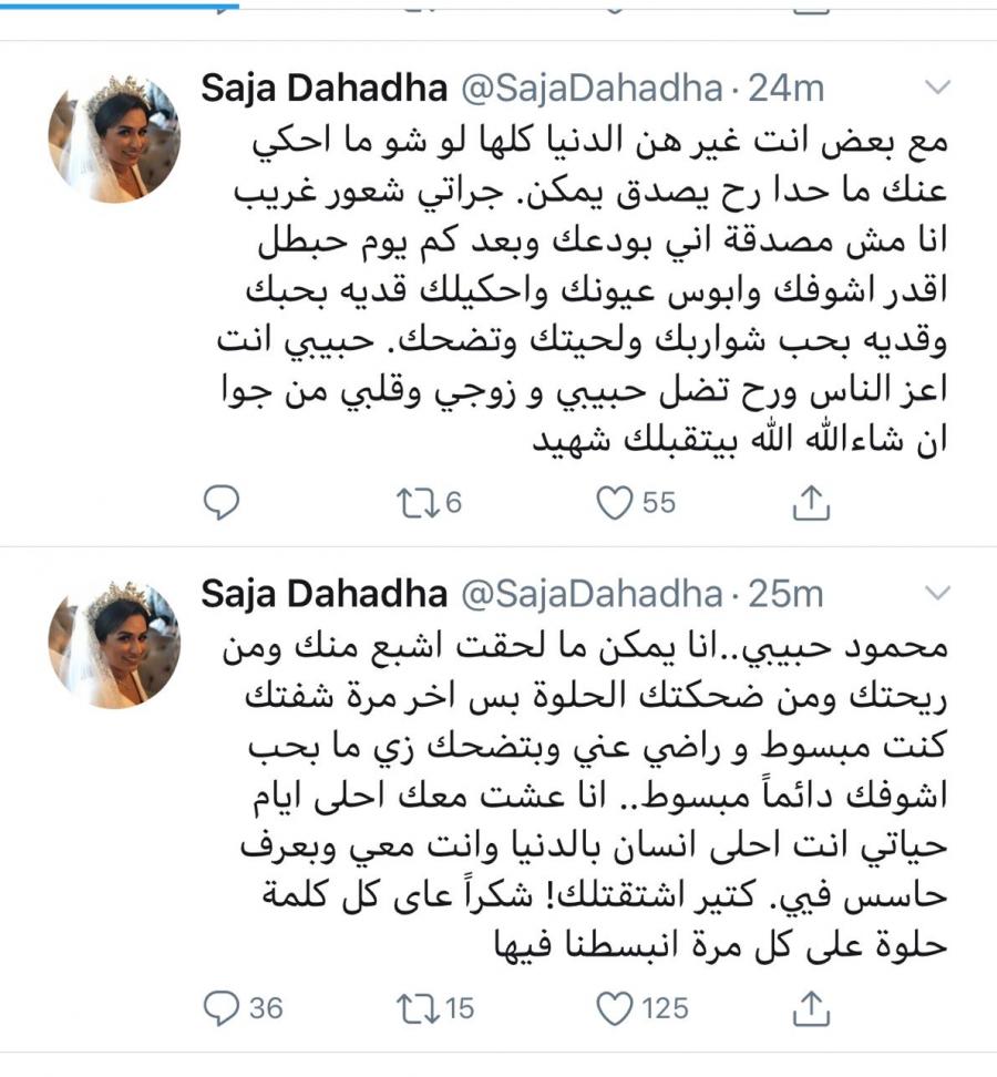 عمانيات - غردت سجى دحادحة عبر صفحتها بتويتر عدة تغريدات تعبر فيها عن مدى حبها واحترامها لزوجها محمود ، والذي مات غرقا في اندونيسيا قبل ايام .