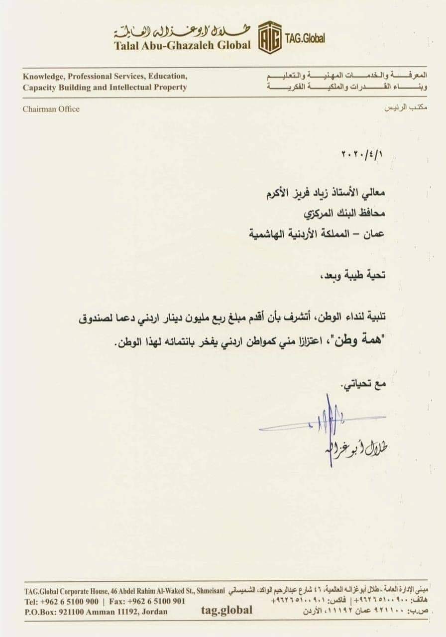 عمانيات - تبرع رجل الأعمال طلال أبو غزالة بمبلغ ربع مليون دينار اردني لصالح صندوق همة وطن.