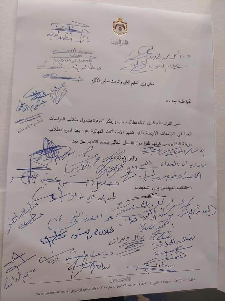 النائب شديفات يتبنى مذكرة لاعتماد الامتحان النهائي لطلبة الدراسات العليا عن بعد.