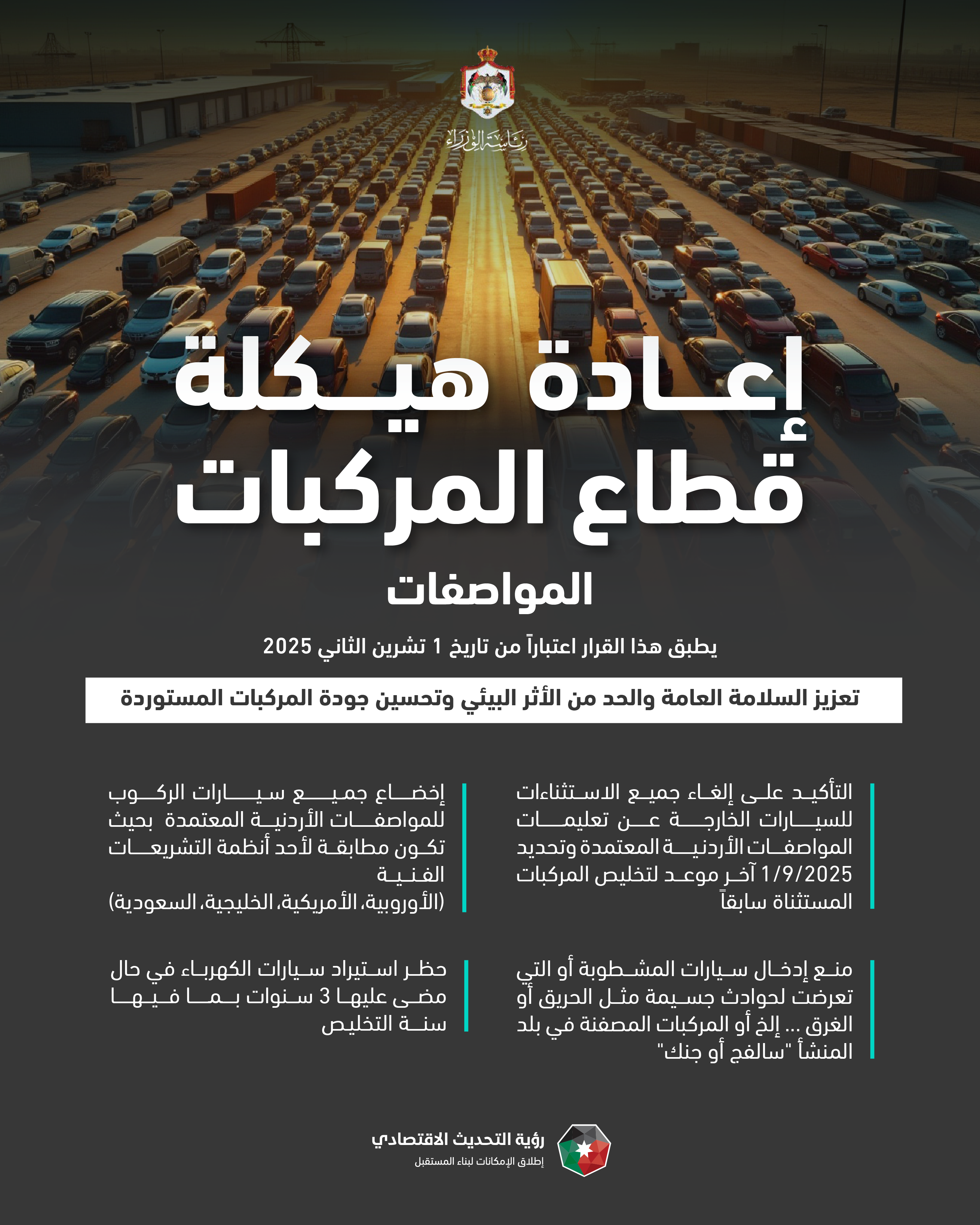 أخبار المملكة - 28-06-2025 10:22 PMإخضاع جميع السيارات لتعليمات المواصفات الأردنية (الأوروبية والأمريكية والخليجية والسعودية) اعتباراً من مطلع تشرين الثاني 2025.*حظر استيراد سيارات الكهرباء في حال مضى عليها...