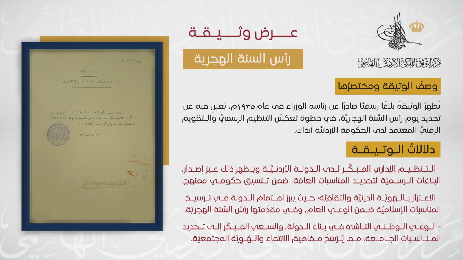 التوثيق الملكي يعرض وثيقة تعود لعام 1935 بمناسبة السنة الهجرية
