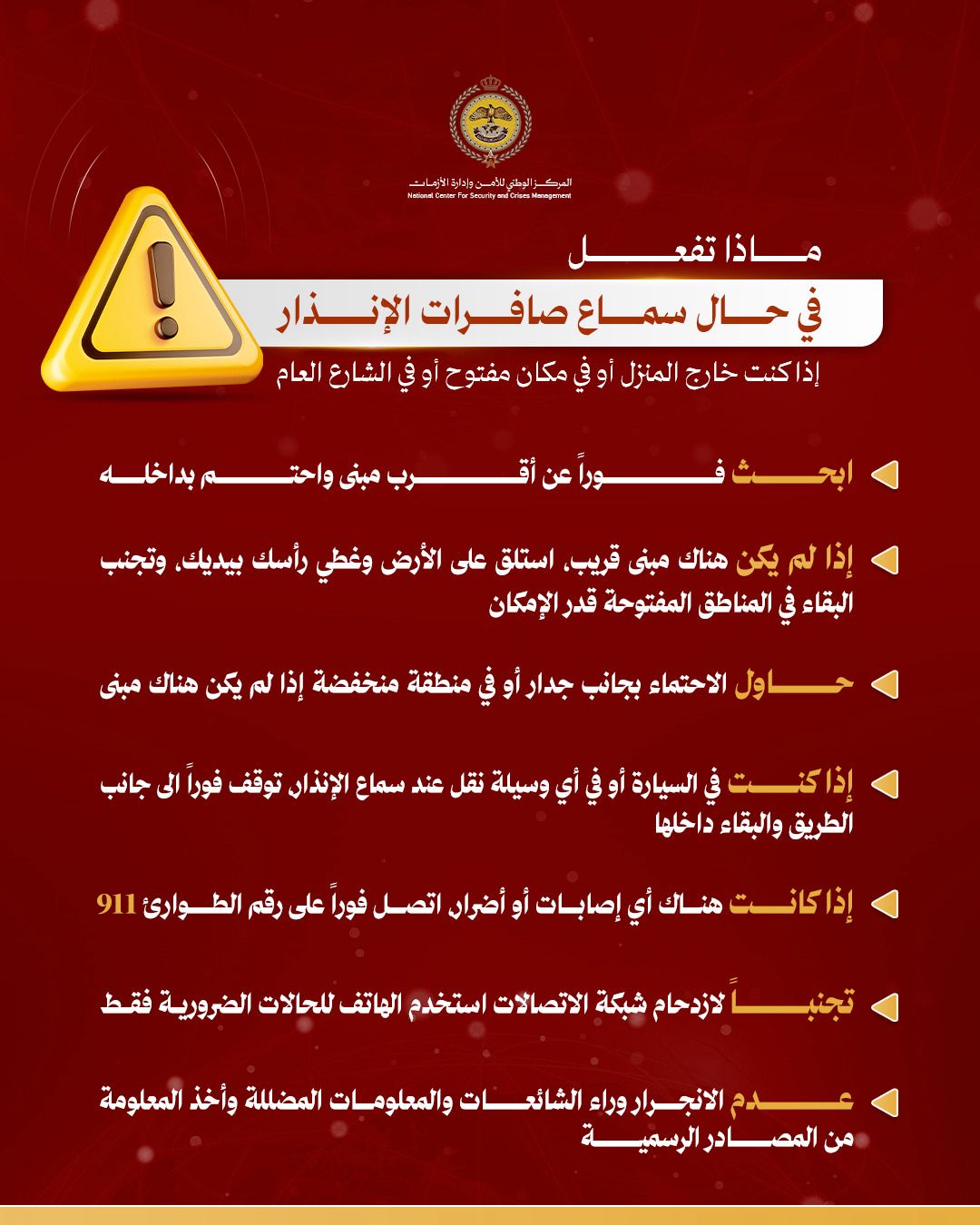 "الوطني لإدارة الأزمات" يصدر إرشادات للتعامل مع صافرات الإنذار وسقوط أجسام من الجو