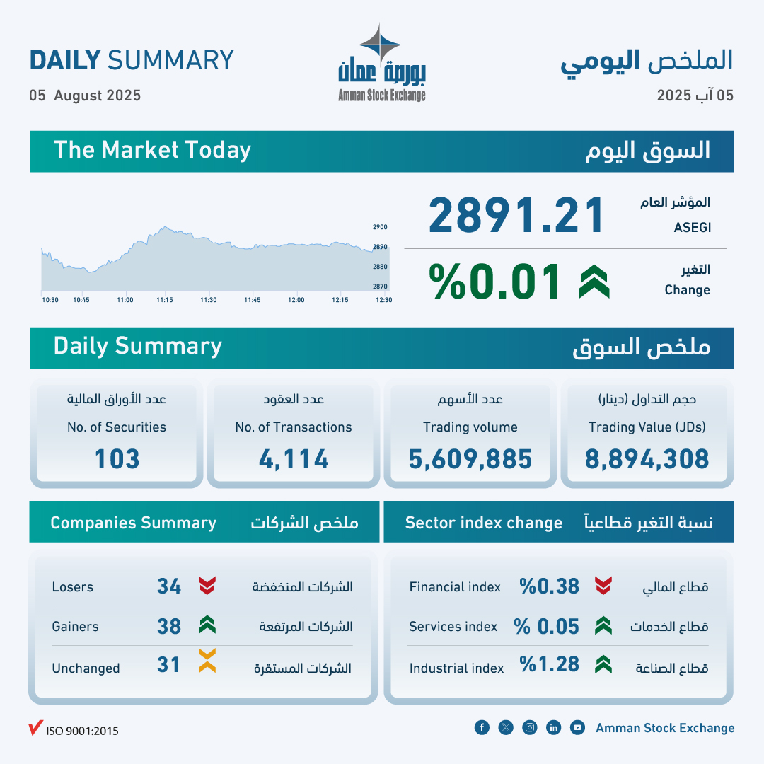 إقتصاد - 05-08-2025 02:34 PM8.9 مليون دينار حجم التداول في بورصة عمان بلغ حجم التداول الإجمالي في بورصة عمان، اليوم الثلاثاء، حوالي 8.9 مليون دينار، فيما بلغ عدد الأسهم المتداولة 5.6 مليون سهم، نفذت...