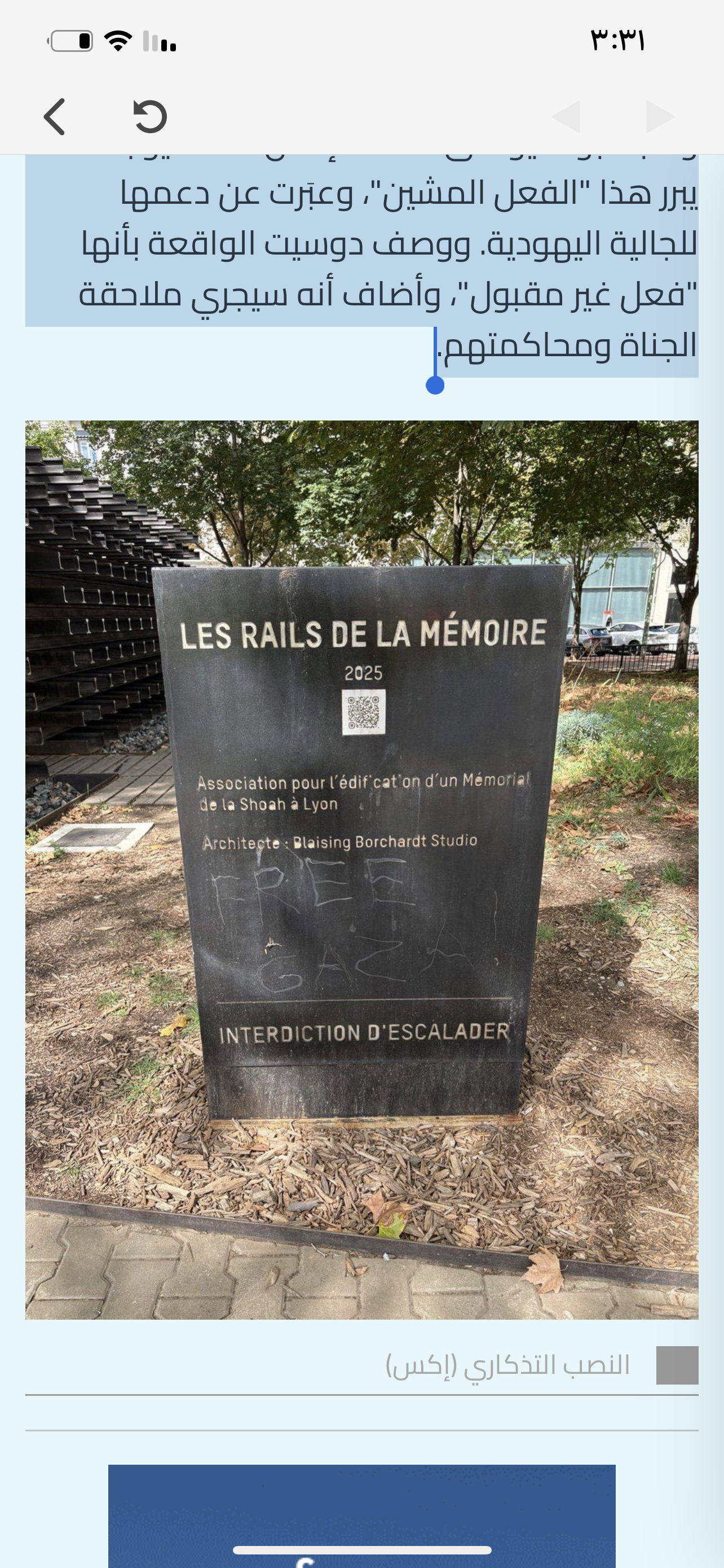 العالم - 31-08-2025 03:34 PMقال مسؤولون محليون في فرنسا إن نصباً تذكارياً للمحرقة اليهودية (الهولوكوست) في مدينة ليون تعرض للتشويه، وأدانوا هذا الفعل.وأظهرت صورة نشرها يوناتان عرفي، رئيس المجلس...