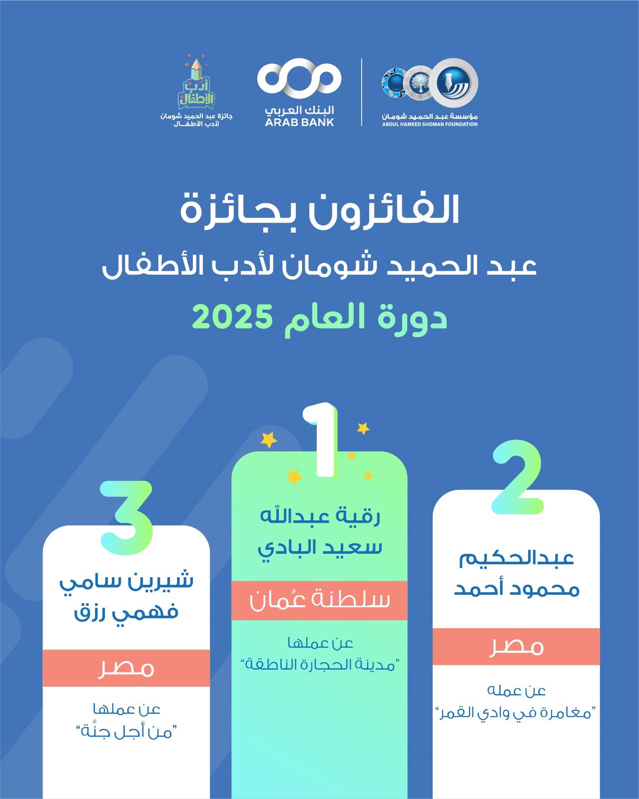 ثقافة - 24-08-2025 04:56 PMأعلنت مؤسسة عبدالحميد شومان عن الفائزين بالمراكز الثلاثة الأولى بجائزتها لأدب الأطفال لعام 2025، والتي اختصت في مجال القصة القصيرة في موضوع أدب الرحلات الموجهة للأطفال في...